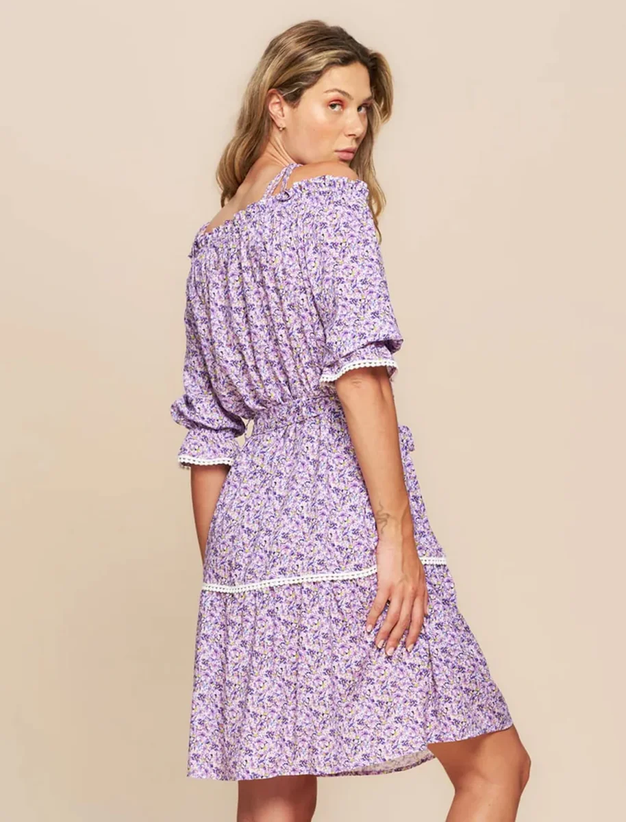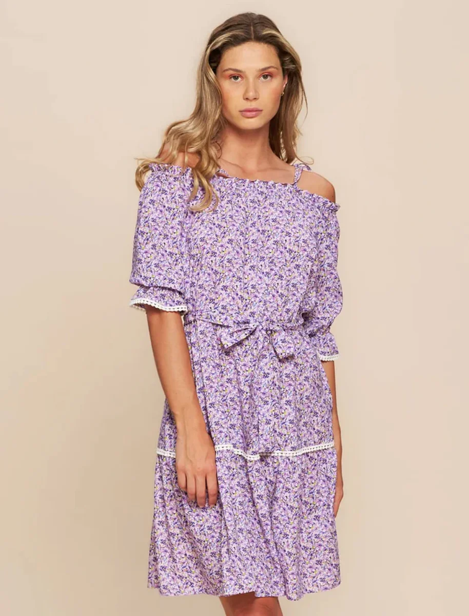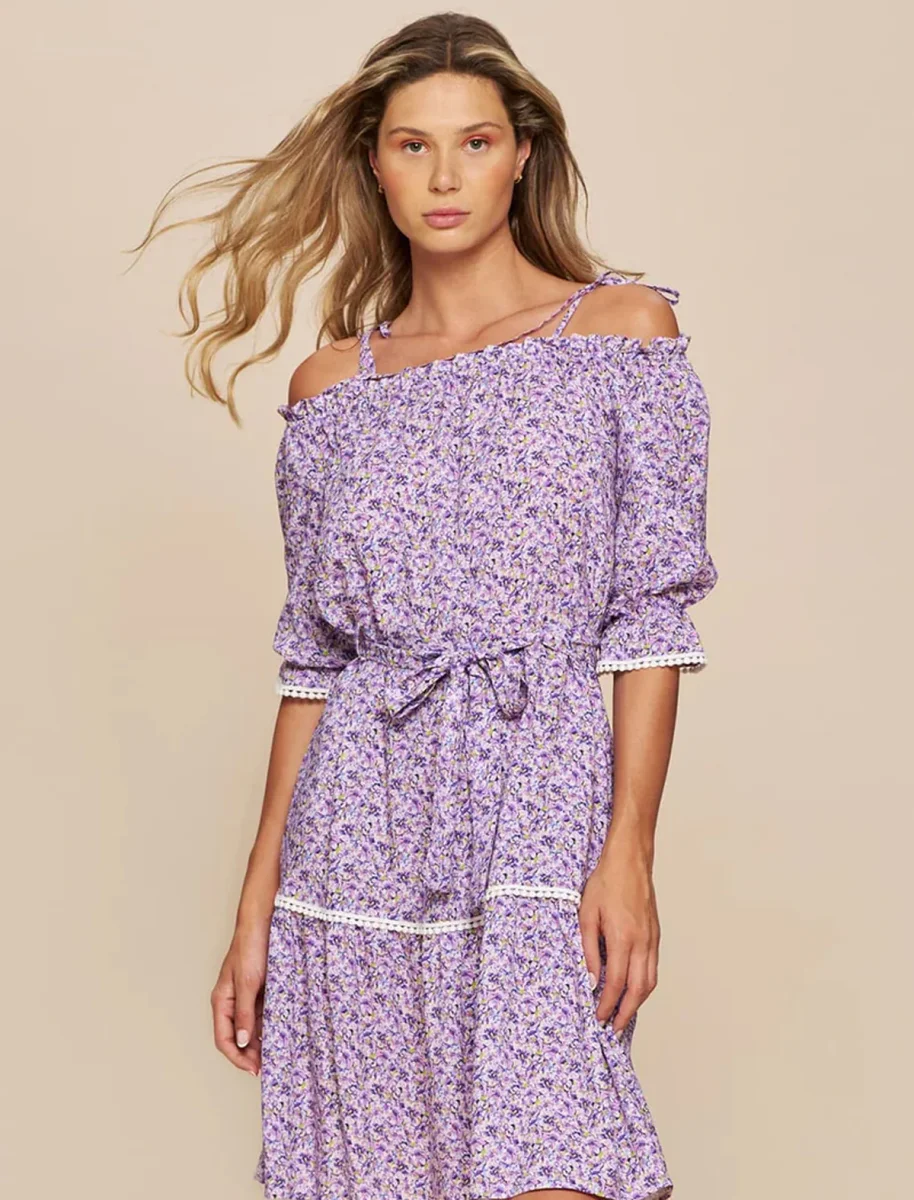 Abito corto estivo a microfantasia floreale con scollo bardot. Scopri il fascino floreale del nostro adorabile abito corto estivo, caratterizzato da una delicata microfantasia floreale. Con uno scollo bardot che aggiunge un tocco di sensualitร e femminilitร , questo abito รจ perfetto per le giornate estive. Il suo design versatile e alla moda lo rende ideale per un brunch con le amiche o una serata in cittร . Le maniche sono corte, con elastico e pizzo bianco, ha una cintura in vita ed un giro di pizzo sulla gonna.