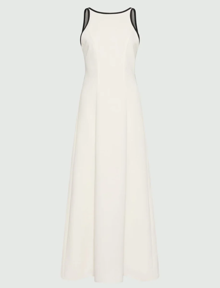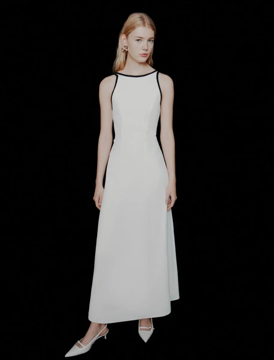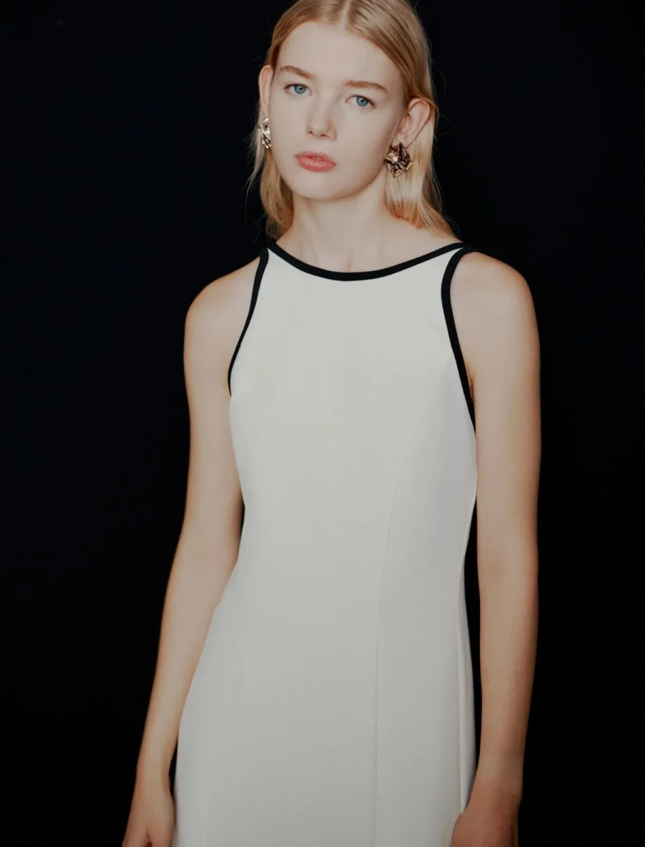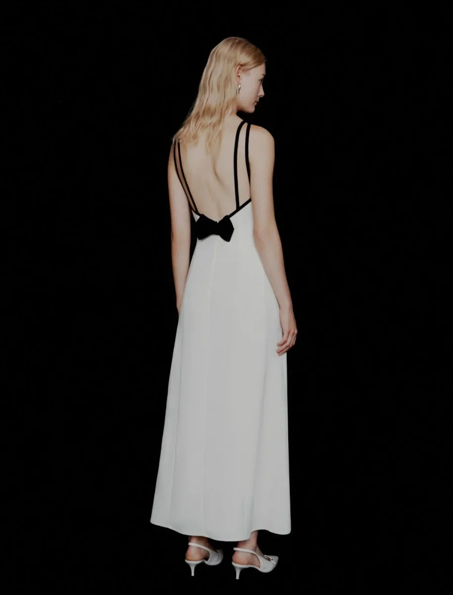 Dettagli a contrasto e silhouette decisa: il nuovo abito mixa elementi grafici e sensualitร , grazie all’apertura sulla schiena. Con fiocco posteriore per un touch romantico.