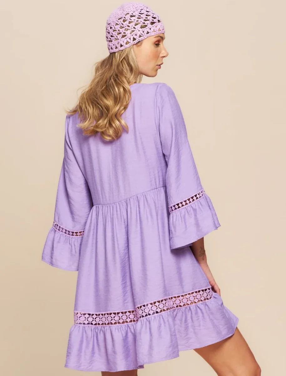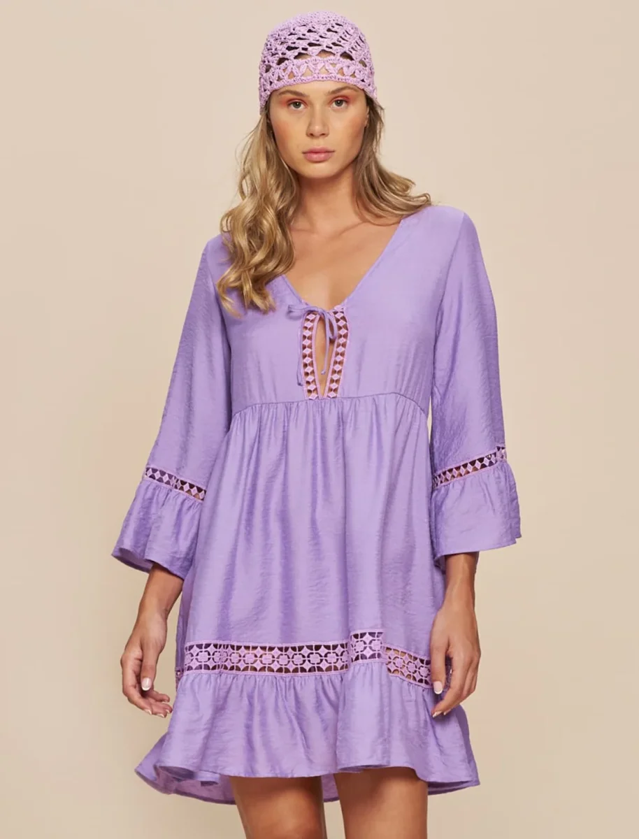 Caftano estivo con pizzo – Bellissimo caftano estivo da donna in tessuto di viscosa effetto lucido. I capi realizzati con questo tessuto risultano molto piacevoli sulla pelle e hanno un meraviglioso panneggio. Questo kaftano corto รจ un perfetto copricostume e, con accessori e sandali diventa un abitino estivo per la sera. Le maniche, la balza e lo scollo sono orlati da un pizzo macramรจ. Il dettaglio in piรน che renderร  speciale il tuo look รจ lo scollo profondo, chiuso da due nastri con nappine.