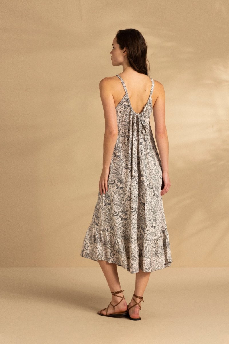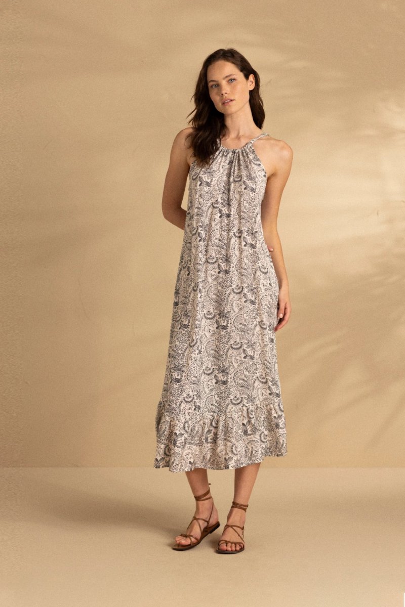 Abito lungo donna viscosa indi long scollo halter con bretelline regolabili da annodare sul retro e rouches sul fondo