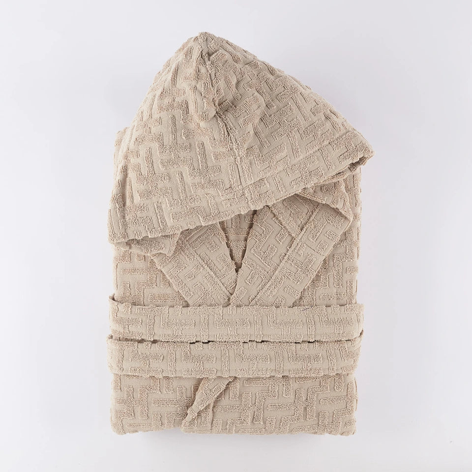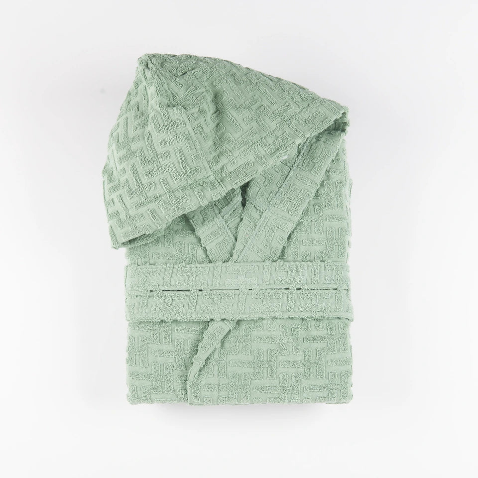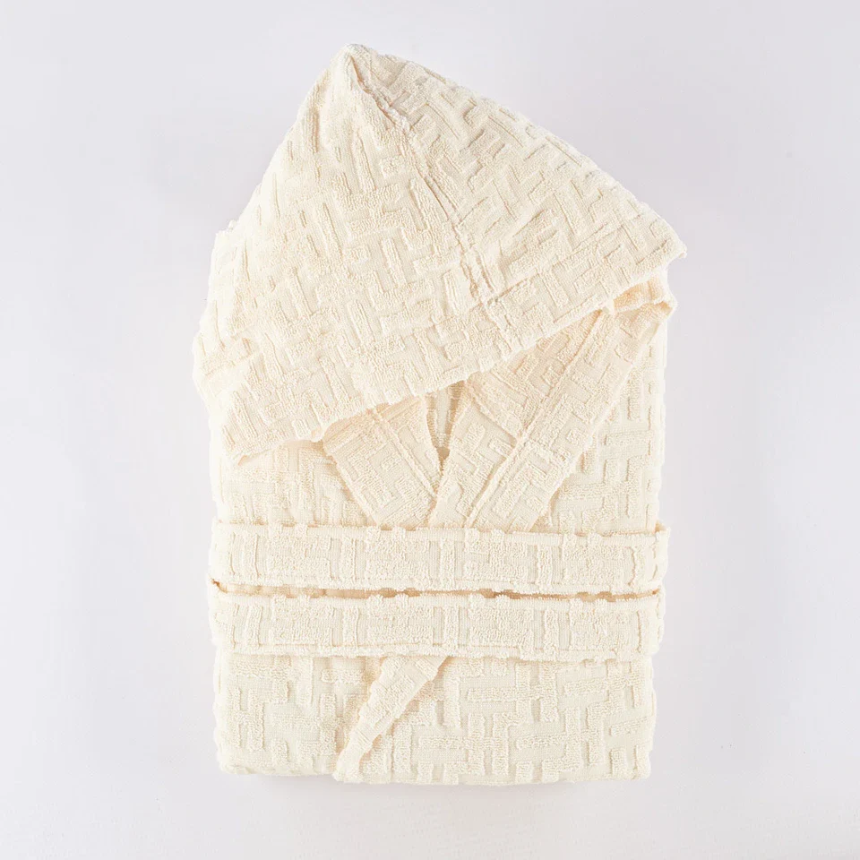 Questo accappatoio รจ dotato di cappuccio, cintura e due pratiche tasche, rendendolo non solo funzionale ma anche un accessorio di design per il tuo bagno. Disponibile in diverse taglie, S, M, L, XL e XXL, si adatta perfettamente a ogni silhouette.