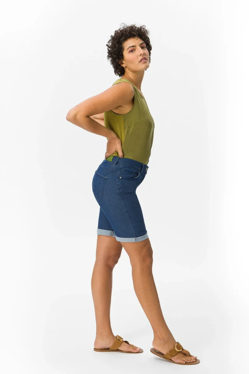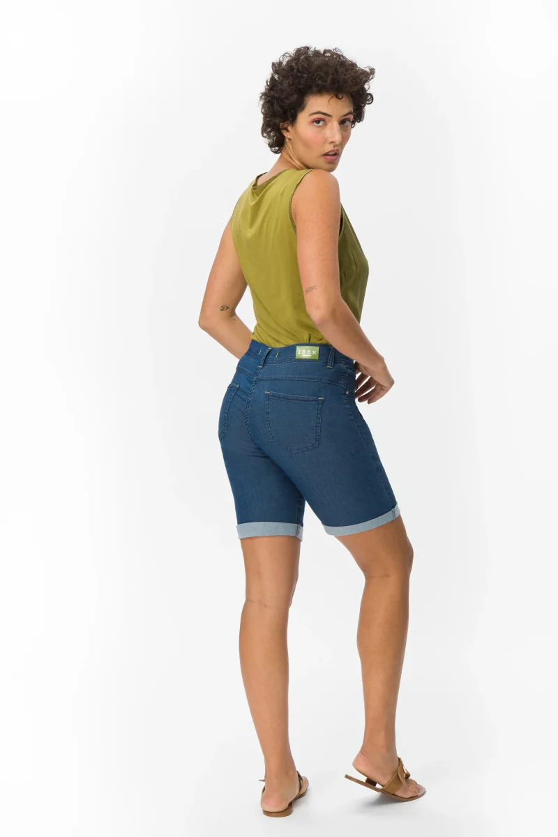 Bermuda in denim blue super stretch con risvolto al fondo. Questo modello รจ costruito con vita media elasticizzata, chiusura con zip e bottone, pratiche tasche. Un jeans sportivo, versatile e quotidiano.