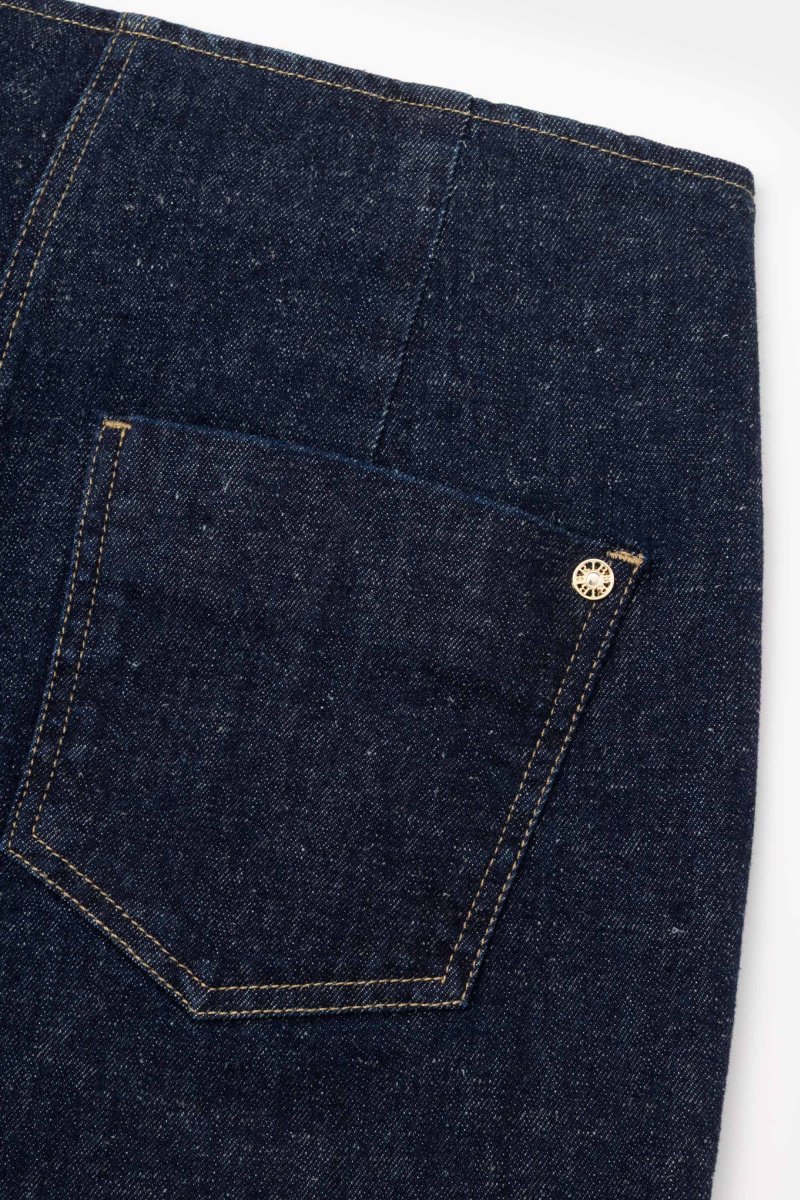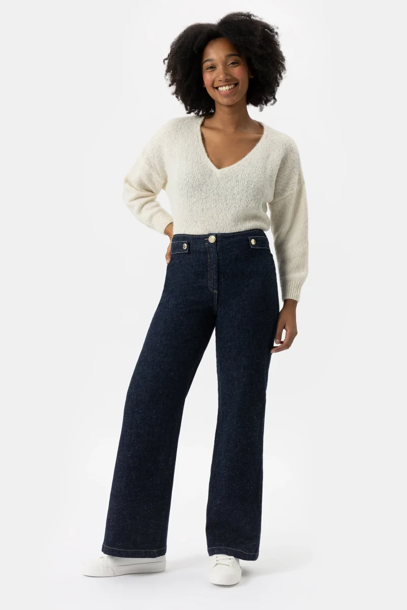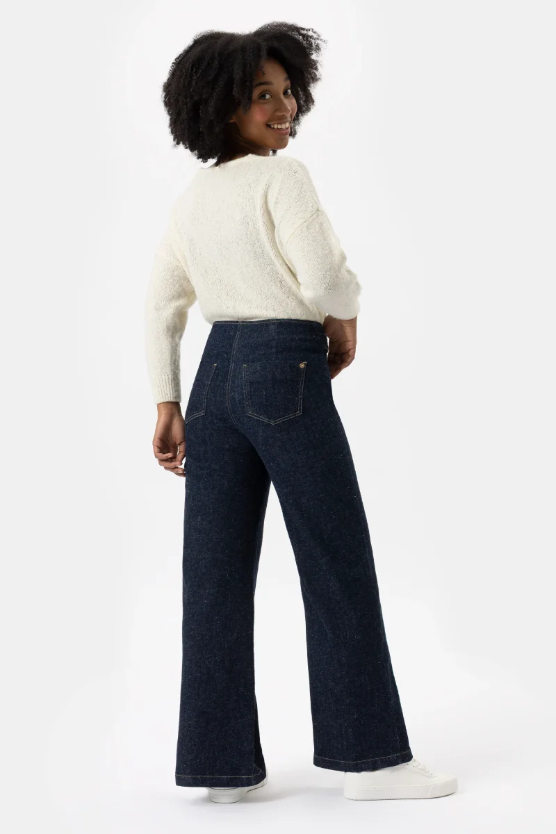 Jeans Eco Friendly in denim blu super stretch con vestibilitร palazzo e gamba ampia. Questo modello รจ costruito con vita regolare elasticizzata, chiusura con zip e bottone. Un pantalone attuale, comodo e per ogni occasione, da quelle piรน quotidiane a quelle piรน eleganti. Abbinalo alla scarpa giusto e sarร un capo essenziale per questa stagione, facendoti sentire attuale e alla moda.