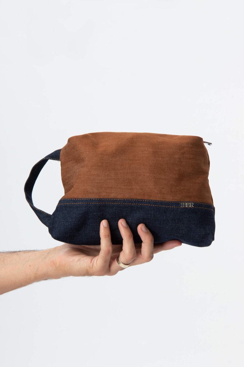 L’interno spazioso organizza alla perfezione i prodotti da bagno grazie alla tasca con zip. Il largo manico in jeans consente di appendere comodamente l’accessorio