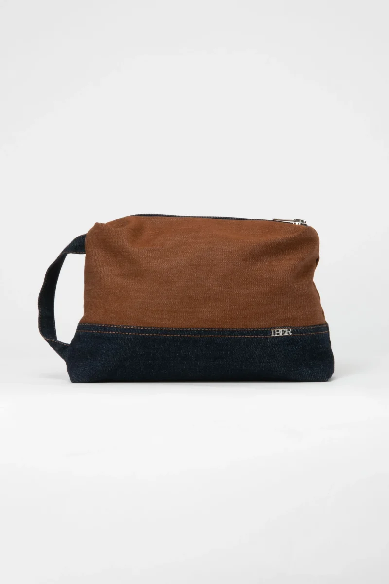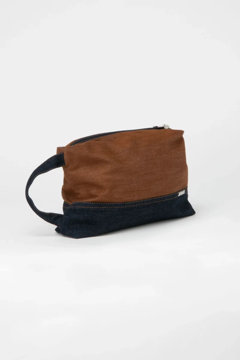 Beauty case in jeansJeans color ocra con dettagli a contrasto jeans blu con fodera fantasia colorata.