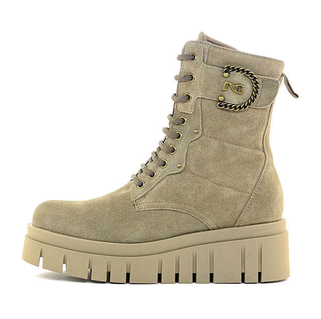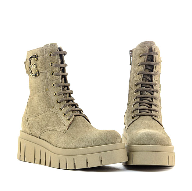 Anfibio Donna argilla in camoscio, impreziosito da dettaglio gold-metal laterale. La zip laterale facilita la calzata. Linea grintosa per un look di tendenza. Made in Italy.