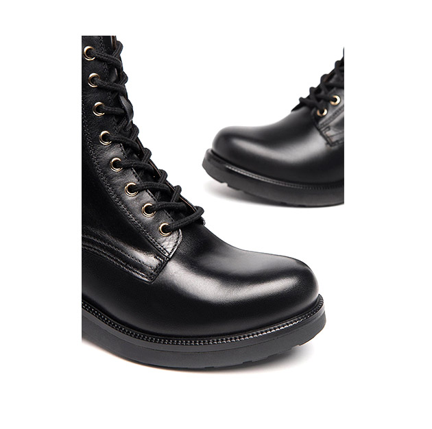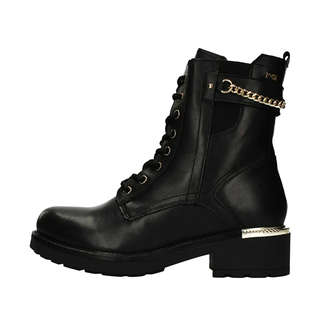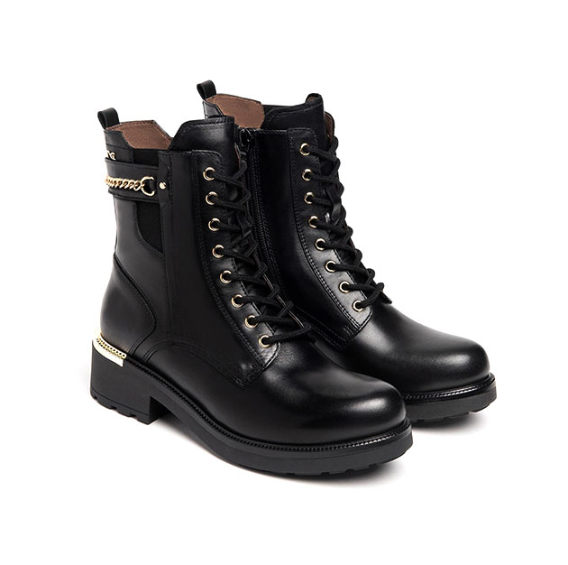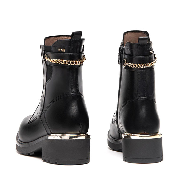Anfibio Donna nero in pelle, con catena decorativa oro dietro al gambale. Dettaglio metal gold sulla gomma. Design grintoso e ricercato per un look di tendenza. Made in Italy.