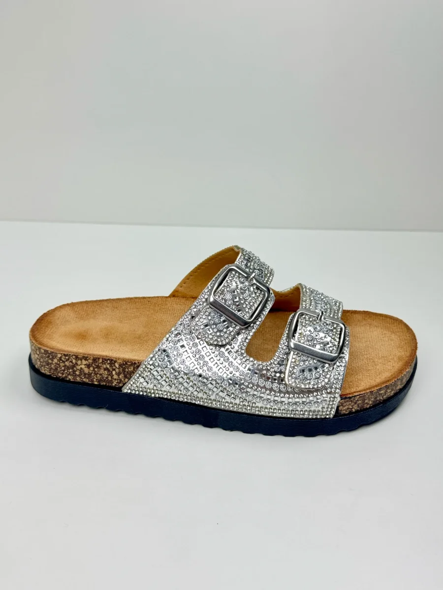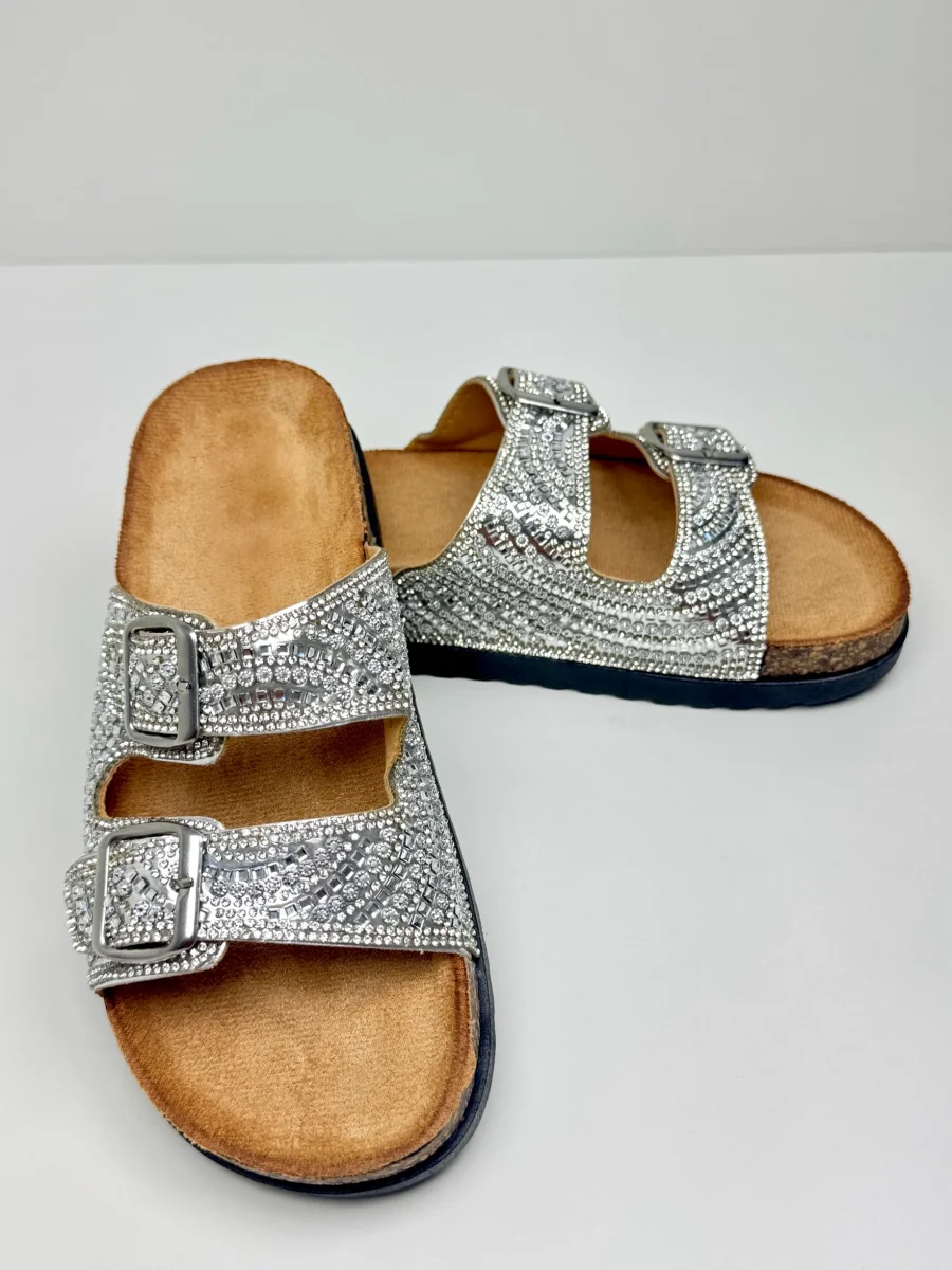 Le ciabattine Bali presentano una doppia fascia regolabile con strass e brillantini. Il sottopiede รจ anatomico in materiale scamosciato e la suola piatta in gomma nera รจ comoda e antiscivolo. Sono disponibili in Nero e Argento.