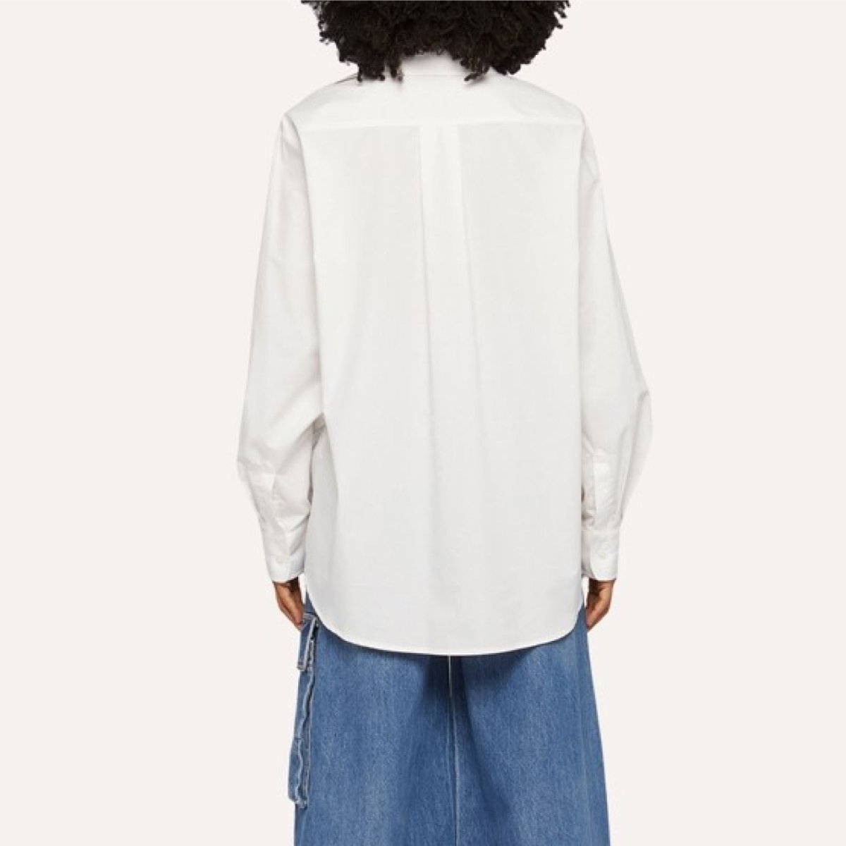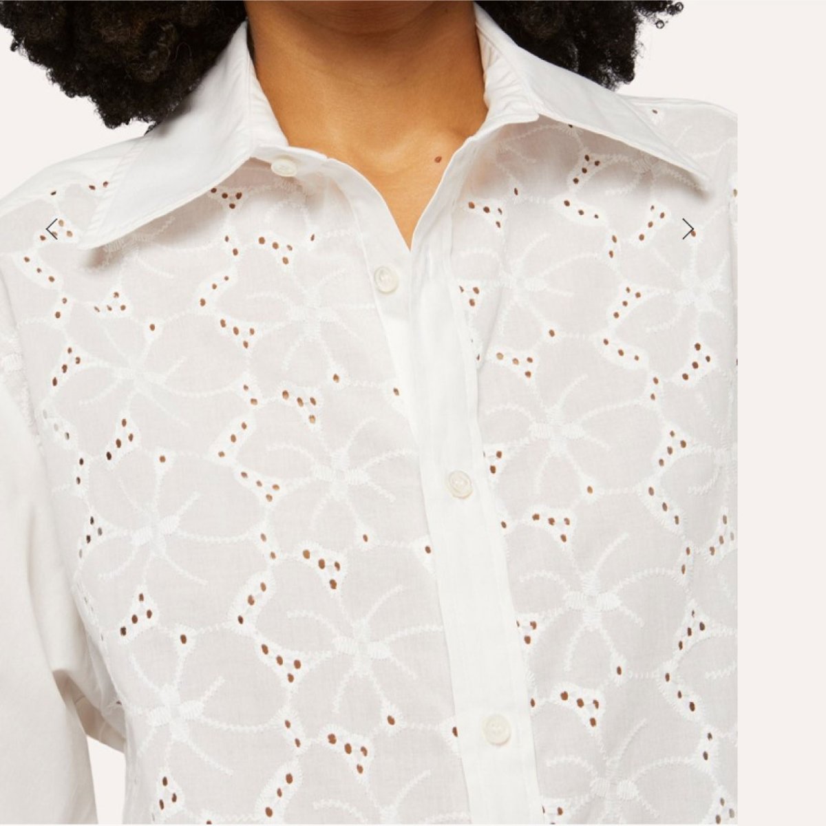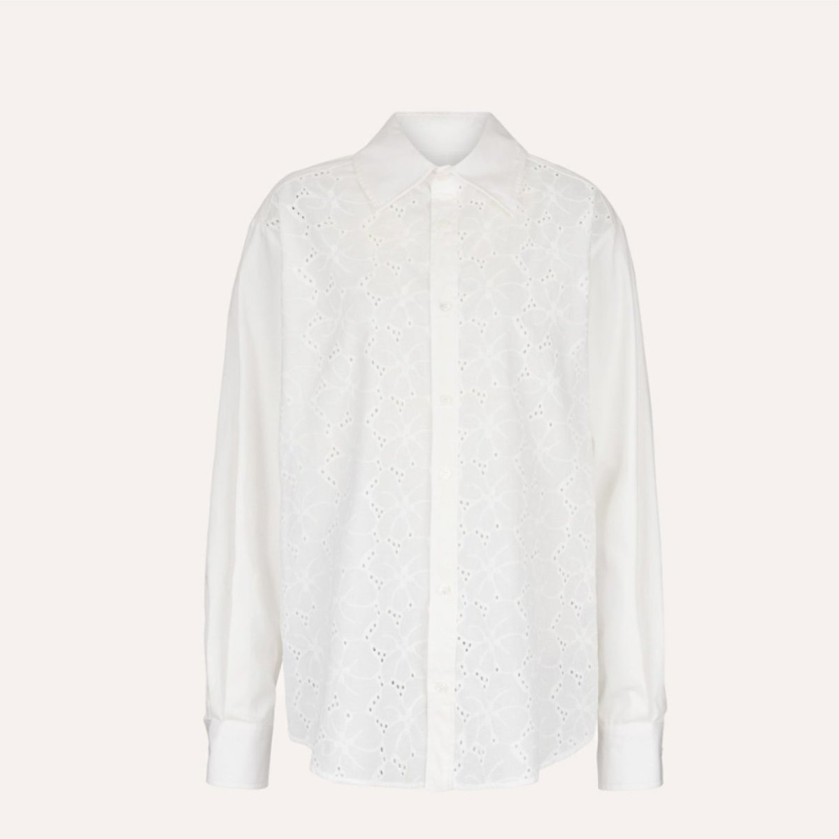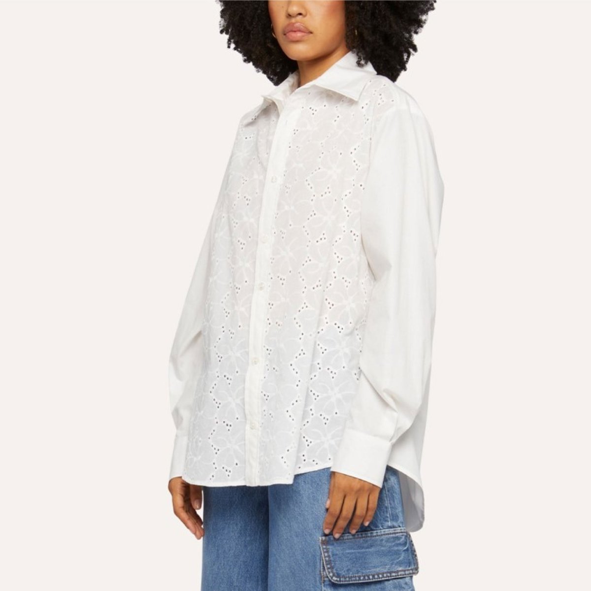 La lavorazione sangallo che riprende il disegno di fiori esotici impreziosisce questo camicione in puro cotone.ย ย Le maniche voluminose riprese dai polsini regalano al capo una vestibilitร over.