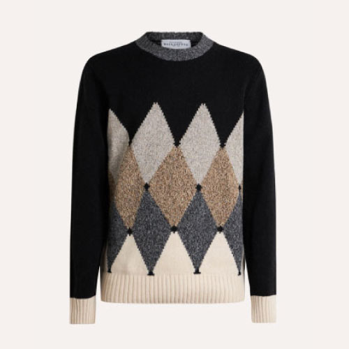 Realizzato in 100% lana mouliné, il petto della maglia è impreziosito dell’iconico intarsio a rombi che evoca l’heritage e la tradizione del brand. Fondi e polsi sono a realizzati a coste, il fit è regular.