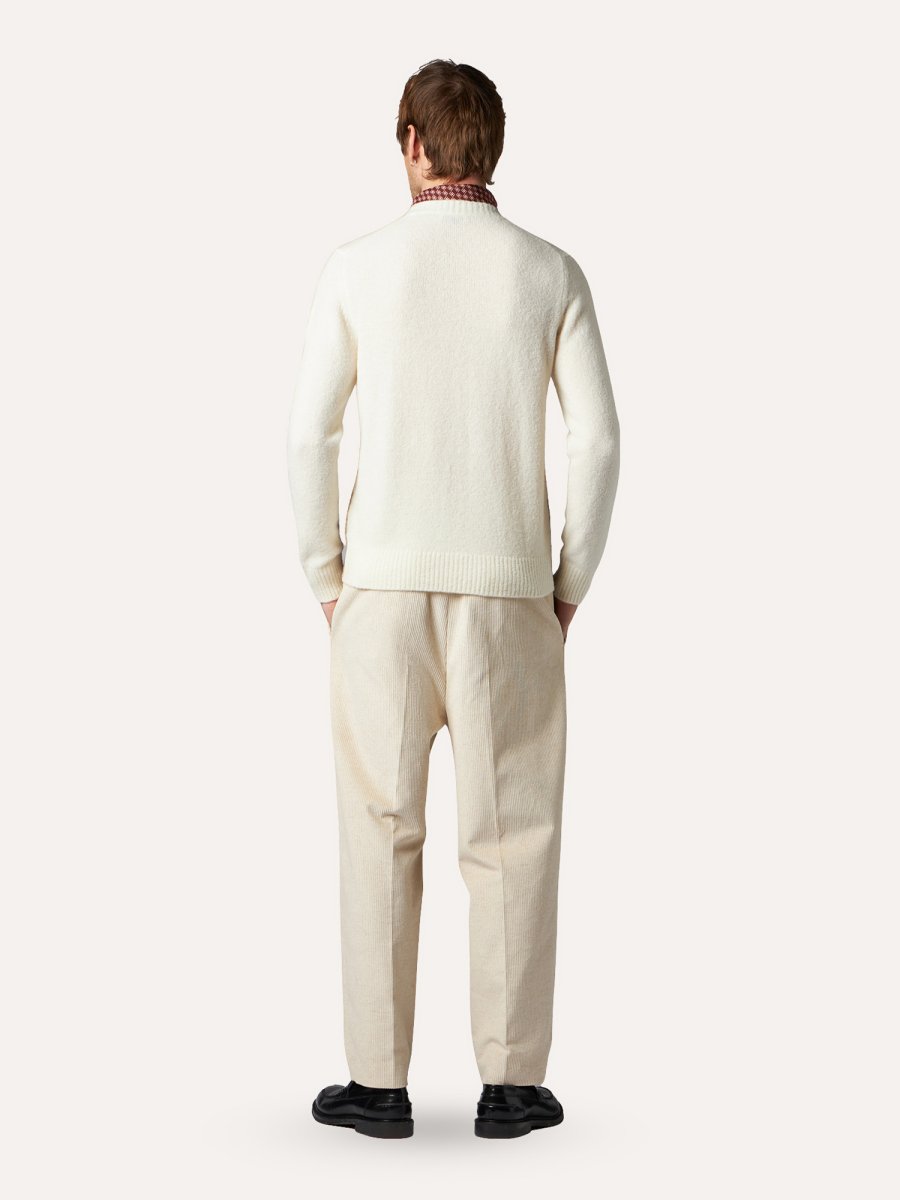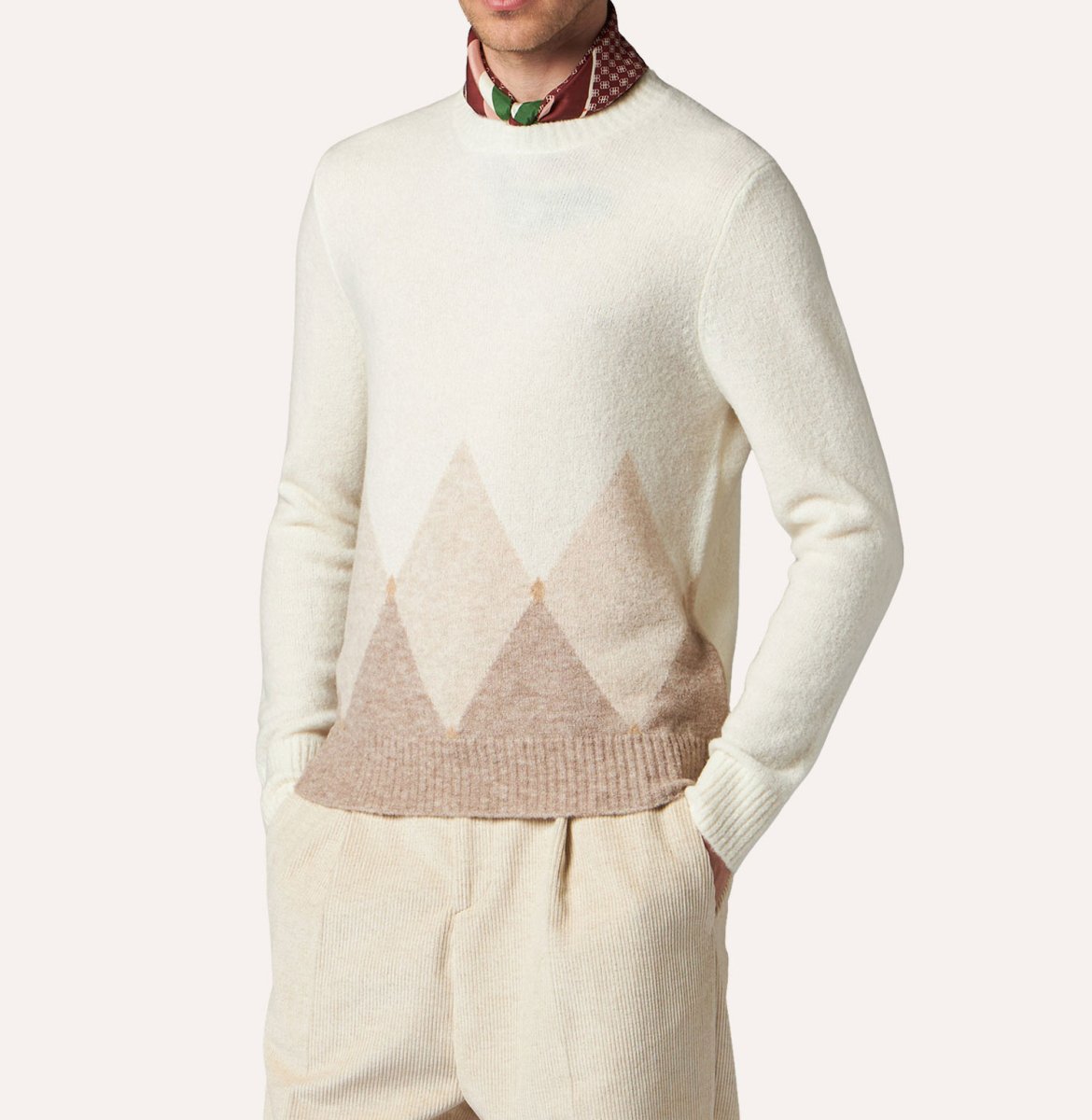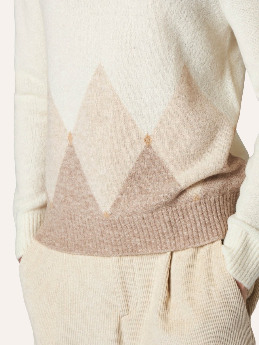 Una palette di colori classica e delicata caratterizza questa maglia girocollo a rombi. Fondi e polsi sono a realizzati a coste, il fit รจ regular.