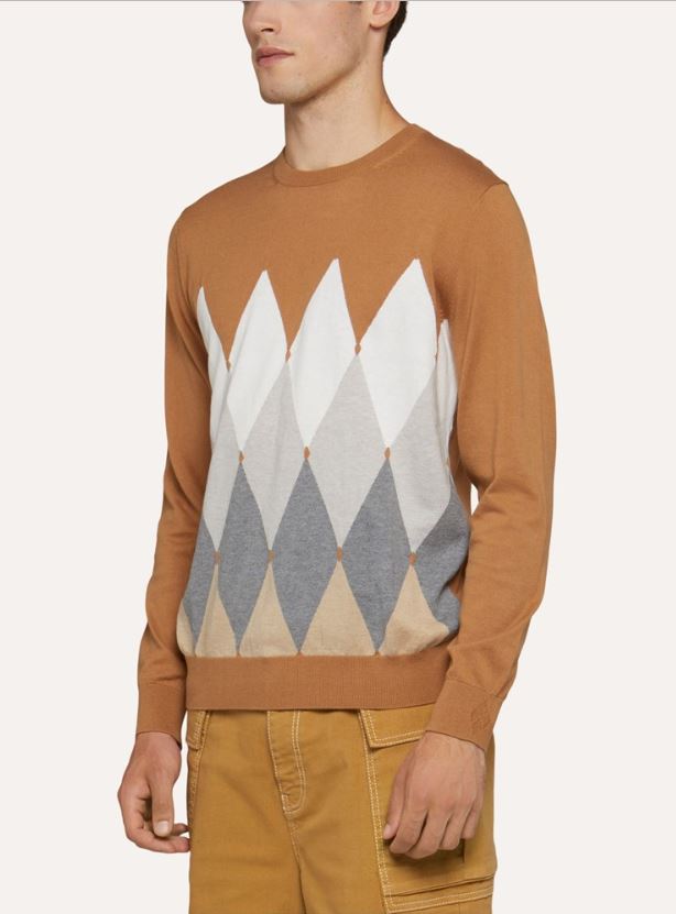 L’iconico intarsio Rombo Classico realizzato con i filati del cotone e del cashmere regala alla collezione una maglia soffice e avvolgente. La maglia girocollo presenta una vestibilitร regular con polsini e fondo in maglia a coste.