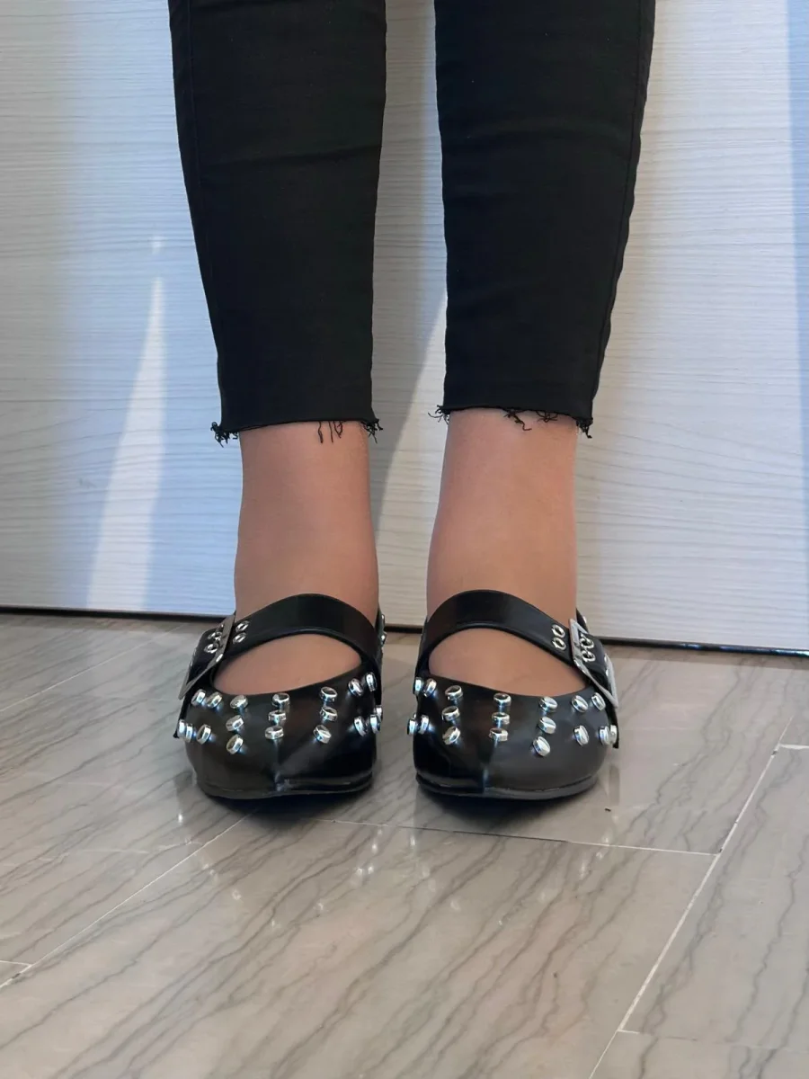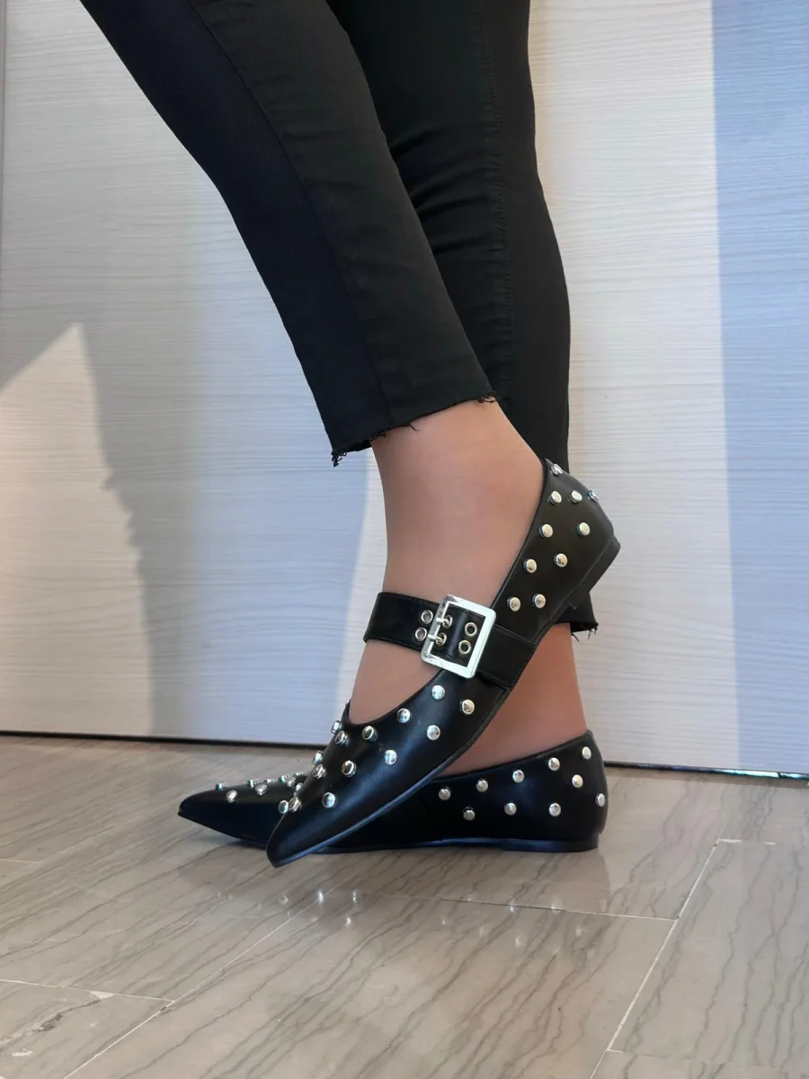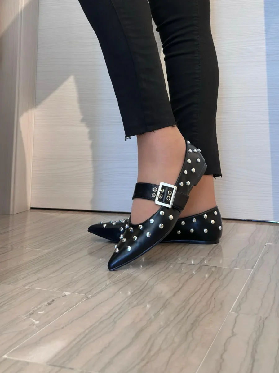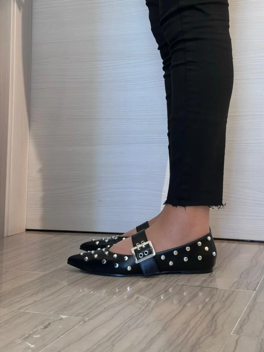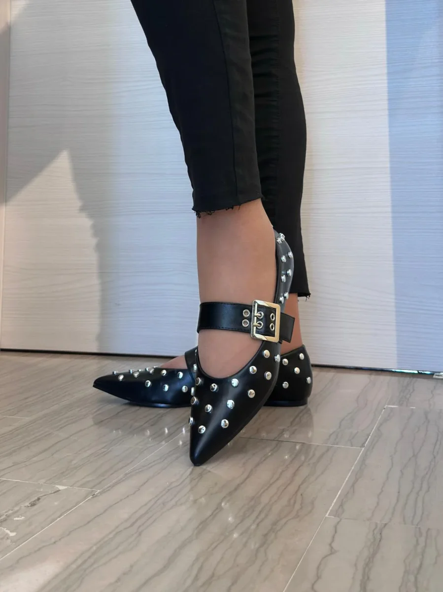 Un mix perfetto di comoditร e stile. Questa ballerina nera a punta, impreziosita da borchie metalliche e cinturino con fibbia, รจ pensata per chi vuole un look deciso ma pratico.