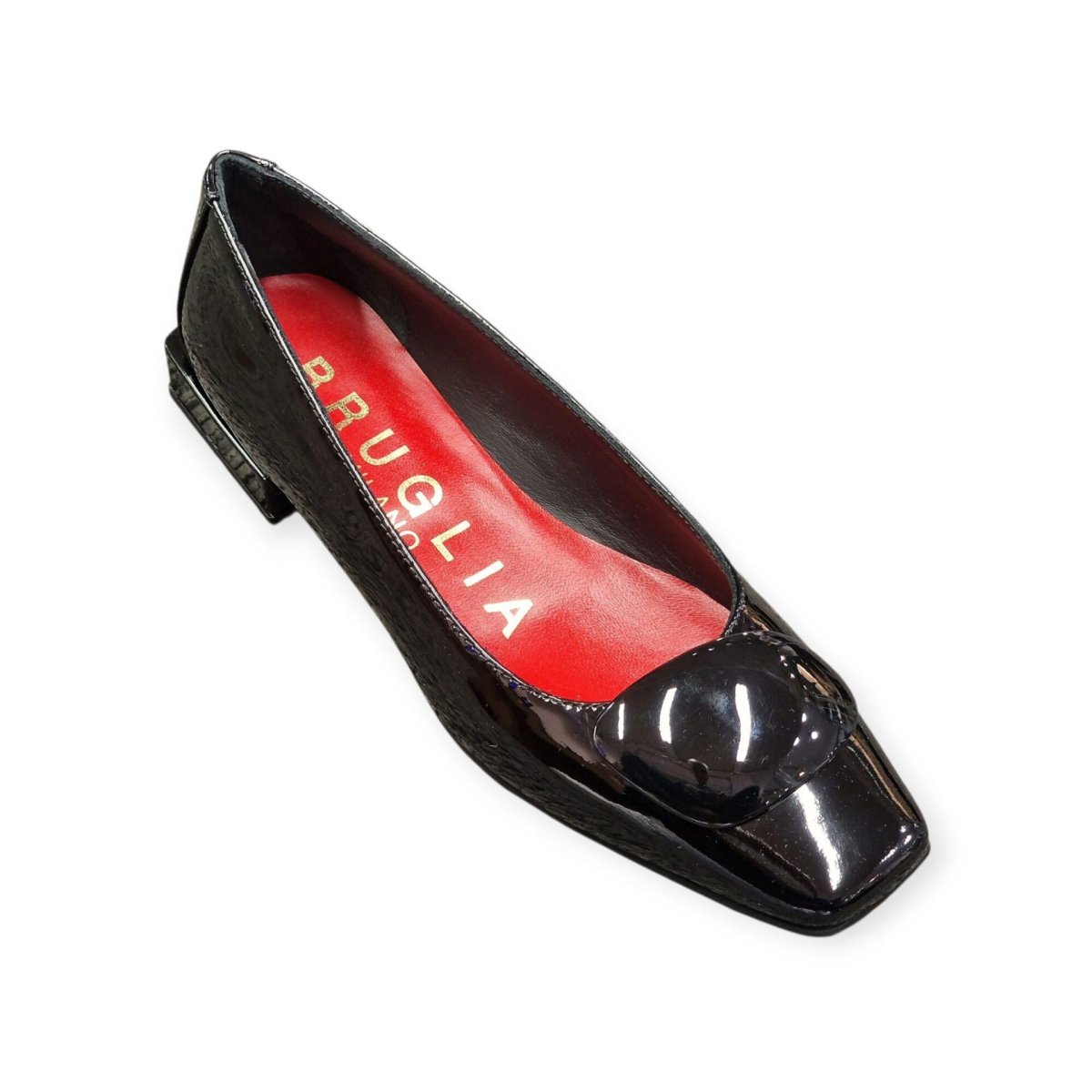 Queste ballerine Bruglia presentano una finitura lucida in vernice che cattura l’attenzione. L’elemento distintivo è la fibbia nera oversize sulla punta, che aggiunge un tocco giocoso ma sofisticato. Con un comodo tacco basso, unisce comfort e stile senza sforzo. Sono perfette da indossare tutto il giorno, sia in ufficio che fuori con gli amici.