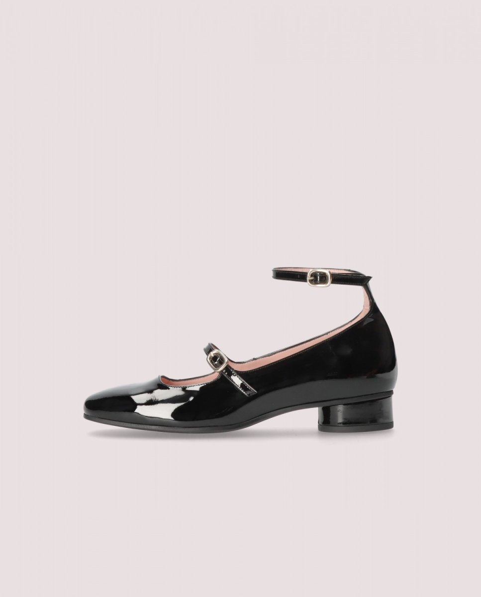 Ballerina Odette con cinturino alla caviglia e tacco rotondo di 30 mm in pelle nera lucida con suola in gomma, soletta e fodera in pelle.