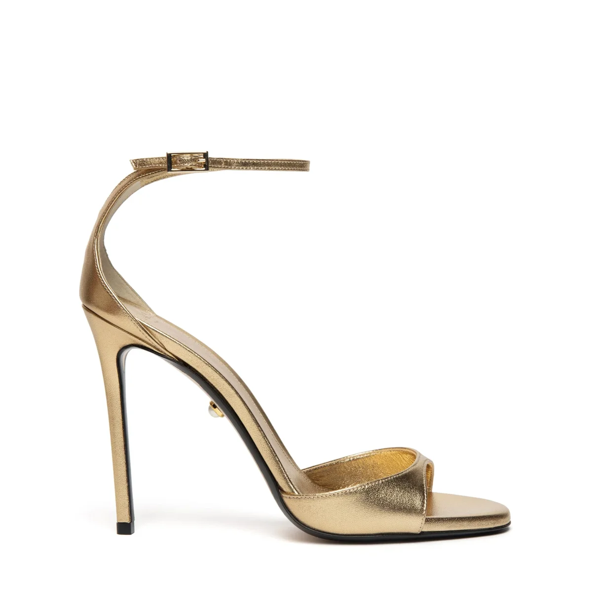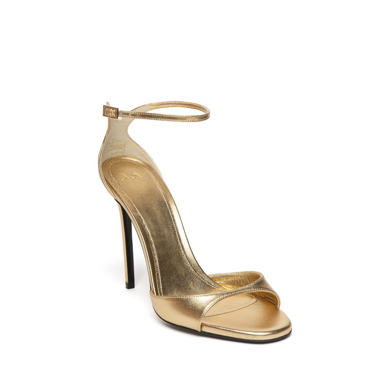 Sandalo realizzato in pelle laminata su tacco a spillo. Perfetto per le occasioni speciali.