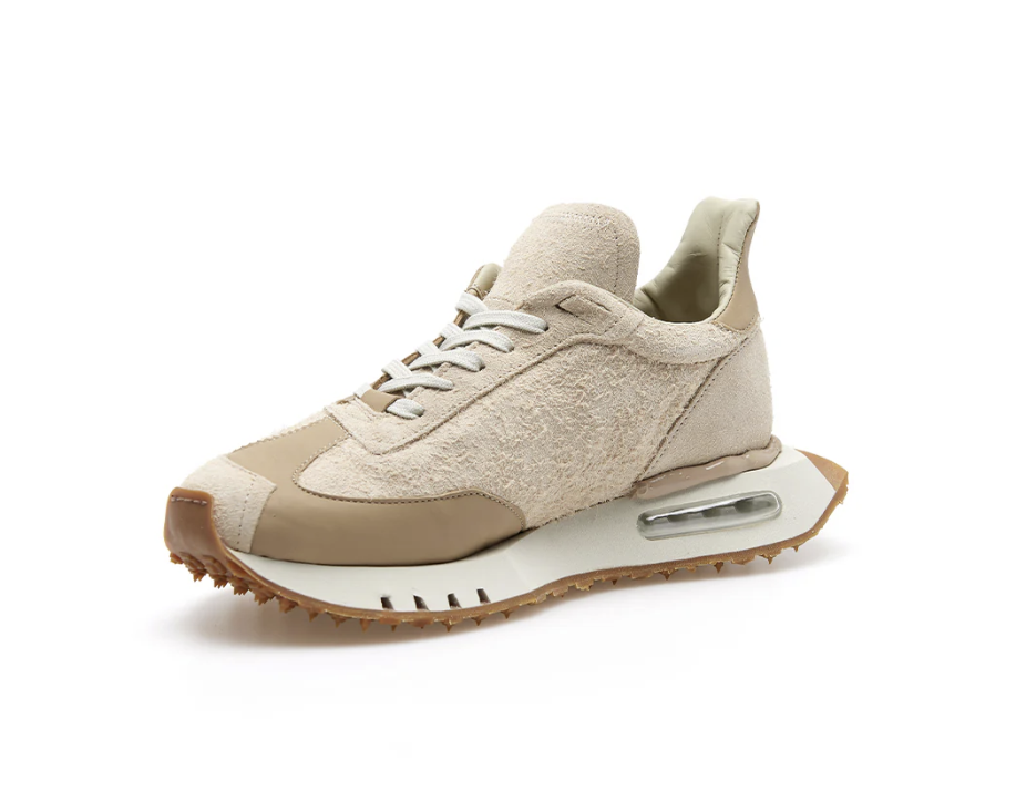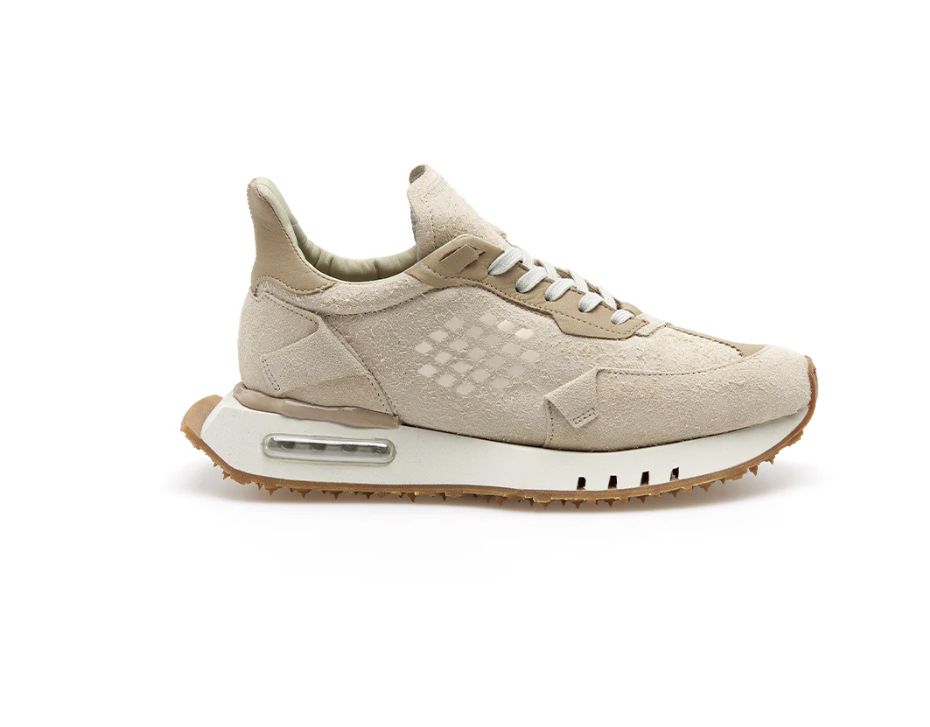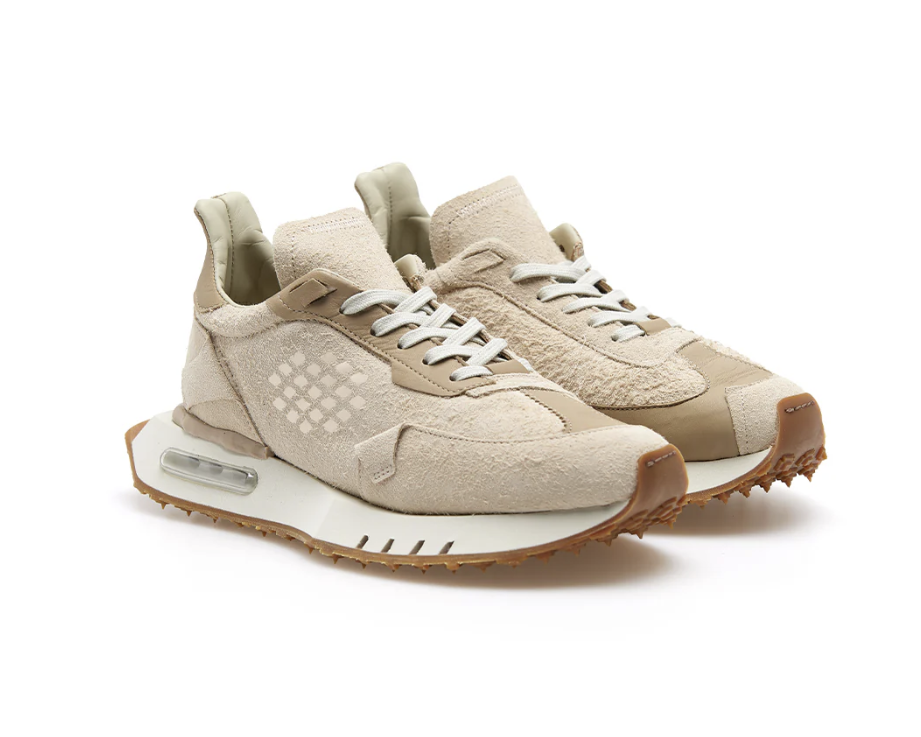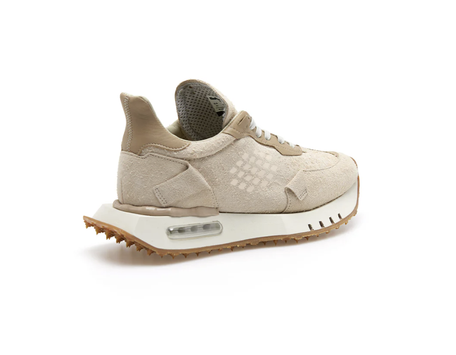 Modello Space Race Wing con taglio a coda di rondine, ricco di dettagli e dal look destrutturato, si caratterizza per la sua asimmetria e patchwork di materiali ricercati, volutamente sovrapposti in modo imperfetto, e per il silicone applicato a mano sul tallone per un tocco ancora piรน artigianale. Il fondo รจ in EVA fresata a mano, leggero e sinuoso, dai volumi oversize ma dinamici, con battistrada in gomma sporgente a piolini, ispirato a quelli da gara degli anni ’70. La suola si caratterizza anche per il cuscinetto dโaria, trasparente o colorato, che ne aumenta l’effetto shock-absorbing. La fodera รจ in pelle sul collarino e in morbida spugna per il resto della tomaia, confortevole ed avvolgente.