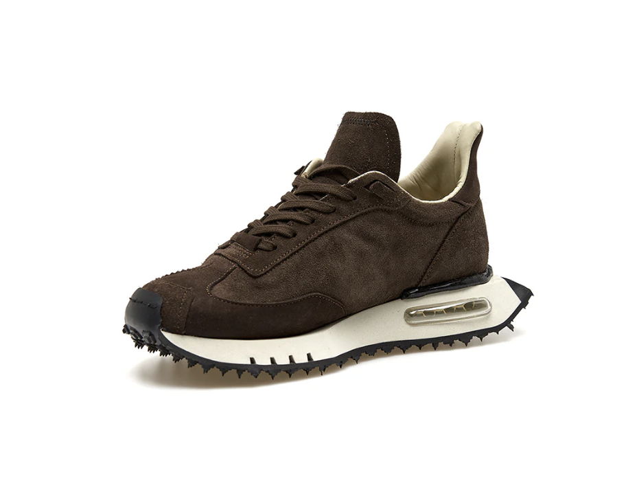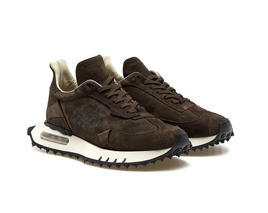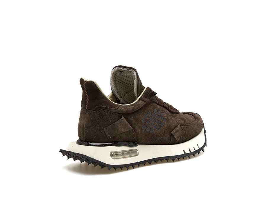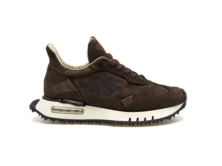 Modello Space Race Wing con taglio a coda di rondine, ricco di dettagli e dal look destrutturato, si caratterizza per la sua asimmetria e patchwork di materiali ricercati, volutamente sovrapposti in modo imperfetto, e per il silicone applicato a mano sul tallone per un tocco ancora piรน artigianale. Il fondo รจ in EVA fresata a mano, leggero e sinuoso, dai volumi oversize ma dinamici, con battistrada in gomma sporgente a piolini, ispirato a quelli da gara degli anni ’70. La suola si caratterizza anche per il cuscinetto dโaria, trasparente o colorato, che ne aumenta l’effetto shock-absorbing. La fodera รจ in pelle sul collarino e in morbida spugna per il resto della tomaia, confortevole ed avvolgente.