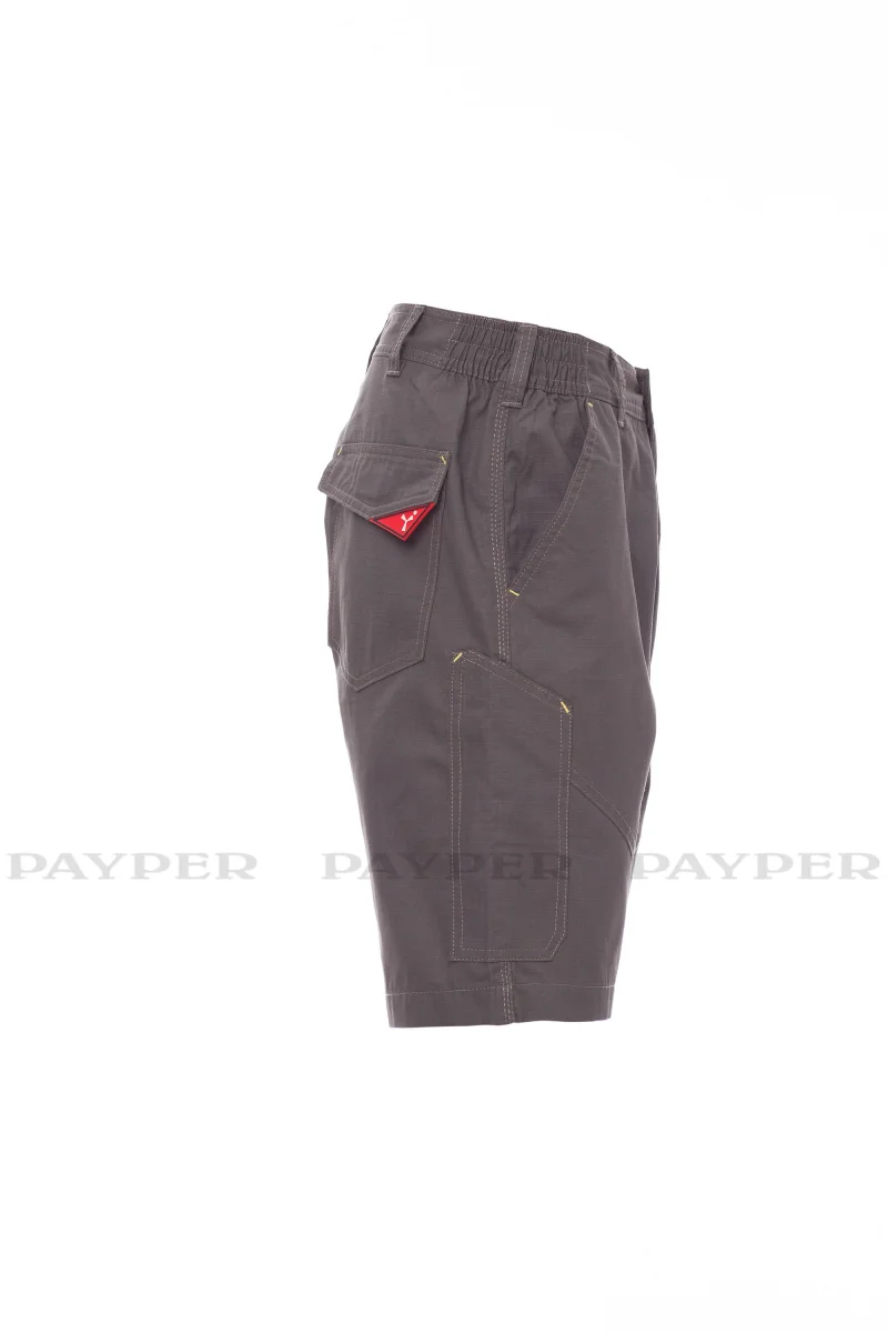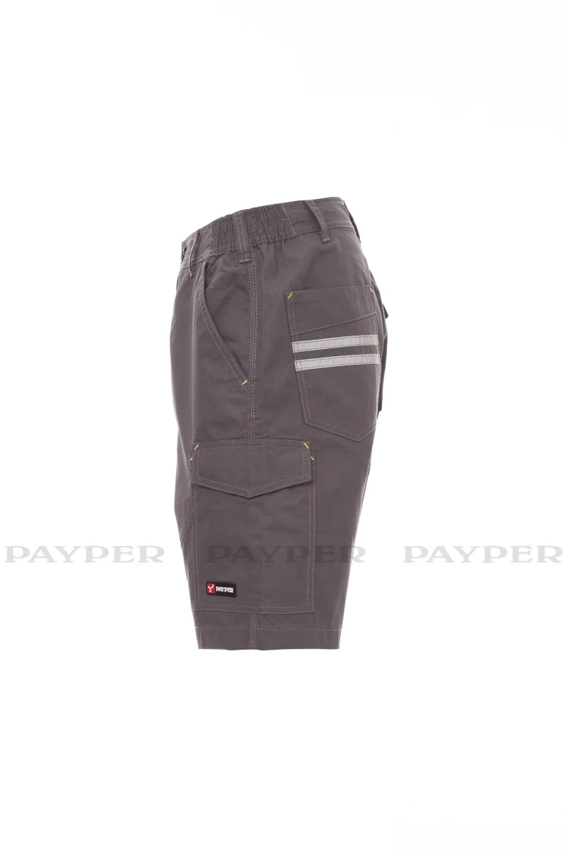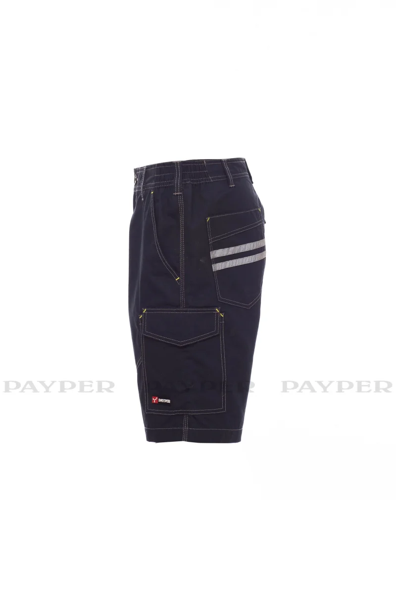 Bermuda da lavoro uomo, con elastici laterali e passanti in vita, chiusura con zip e bottone in plastica, due tasche anteriori a taglio classico, una tasca laterale LOCK SYSTEM, un porta metro, due tasche posteriori una aperta e una con patta e velcro, inserti ed impuntare a contrasto, bande reflex su tasca posteriore, cuciture triple.