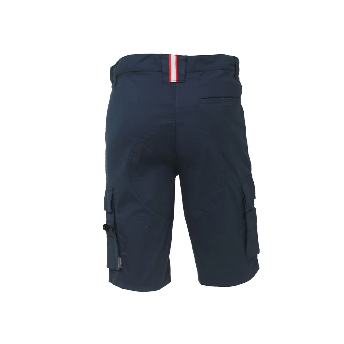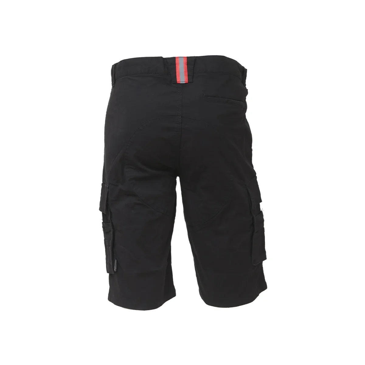 Bermuda Cargo in tela di cotone elasticizzato. Due ampie tasche anteriori, una tasca posteriore con velcro. Due ampi tastoni laterali multifunzionali. Triple cuciture, chiusura con zip frontale e bottone antigraffio. Doppio tessuto di rinforzo sulla parte posteriore. Nastro rosso/reflex su passante tubolare posteriore.