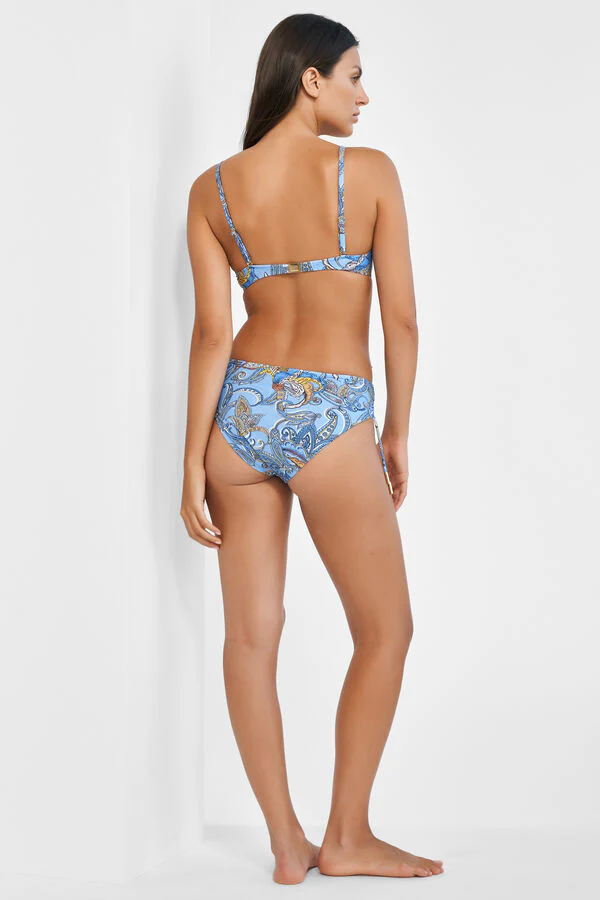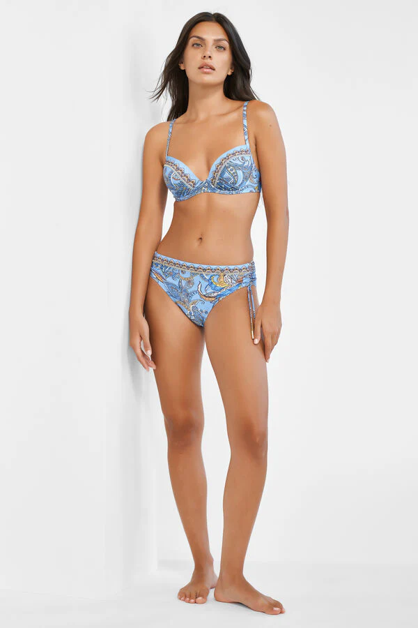 Paisley decorativi e abbellimenti stanno tornando di moda con stampe di ispirazione ornamentale. Il blu pastello dell’orizzonte rappresenta la sensualitร delicata ed estiva con la sua promessa che gli orizzonti non finiscono mai. Con la sua delicatezza, questo colore speciale dona alle storie tipicamente ornamentali con lussureggianti motivi paisley e ai bordi un vero aggiornamento. Pieghe, drappeggi e scollature ovali caratterizzano le silhouette sofisticate. Un punto decorativo color oro chiaro sotto forma di flatlock metallico nasconde abilmente le cuciture divisorie e allo stesso tempo crea un effetto seducente con una discreta lucentezza. Top bikini con ferretto e coppe in schiuma. Coppa C. Cinghie regolabili in lunghezza, rimovibili nella parte posteriore per opzioni di trasporto variabili. Chiusura con clip nella parte posteriore. Slip bikini con taglio gamba variabile. Completamente nutrito. 72% poliammide, 28% elastan.