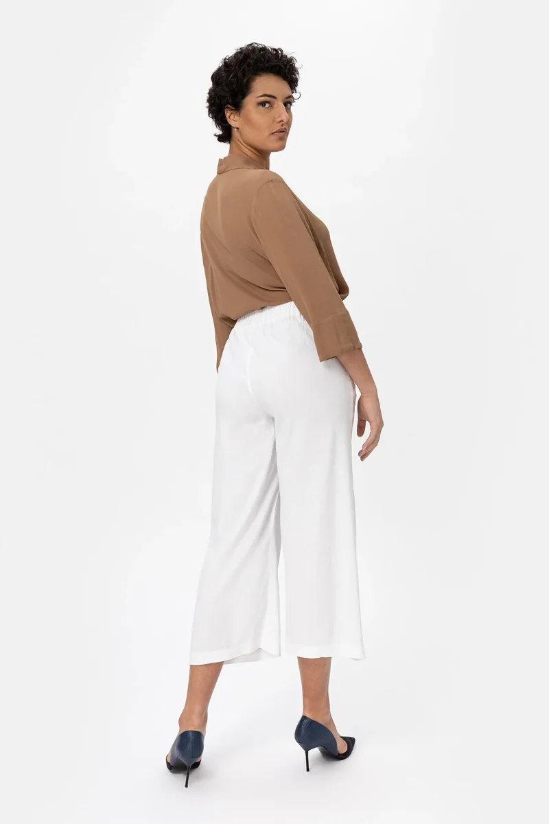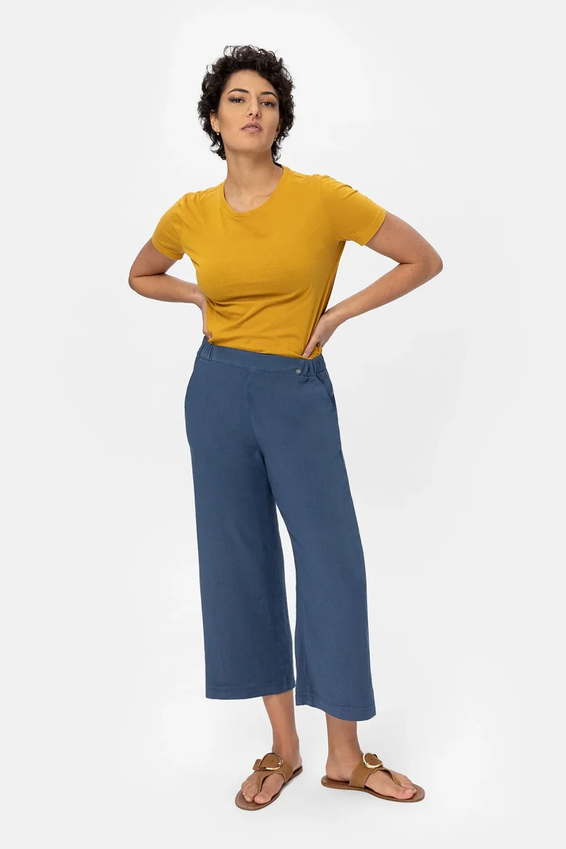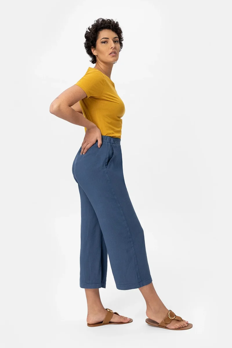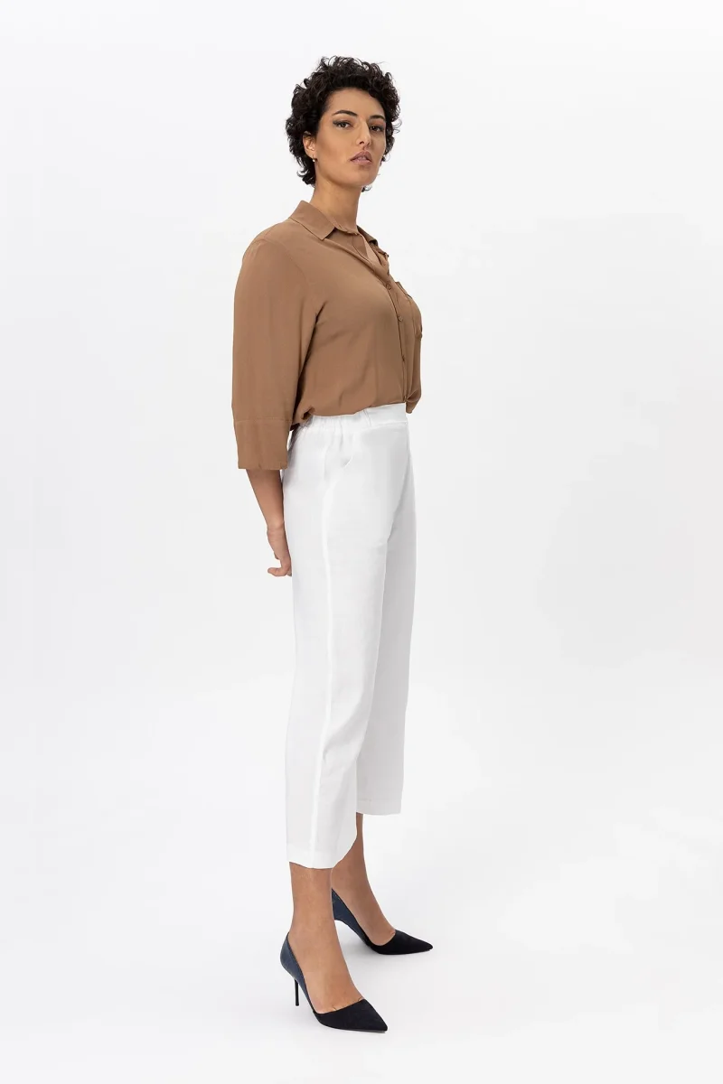 Pantalone cropped in lino super stretch. Il tessuto lino viscosa unisce la freschezza delle due fibre, alla comoditร data dallo stretch del tessuto. Pantalone ampio dalla vita media con elastico cintura dietro e tutto chiuso, senza zip e bottoni. Attuale dona comoditร e freschezza. Disponibile in diversi colori: dai piรน classici ed eleganti a quelli piรน vivaci e sgargianti. Un pantalone morbido, quotidiano e fresco per le giornate piรน calde. Un must have per lโestate.