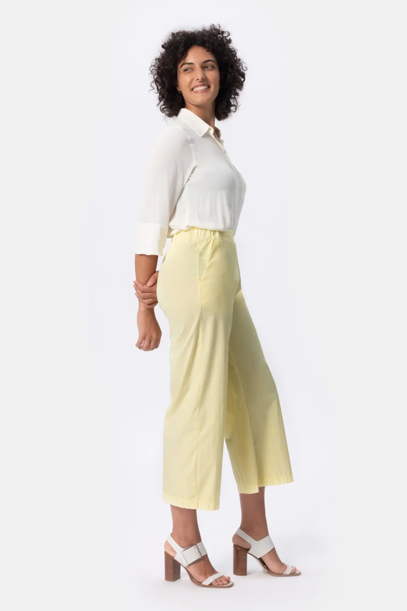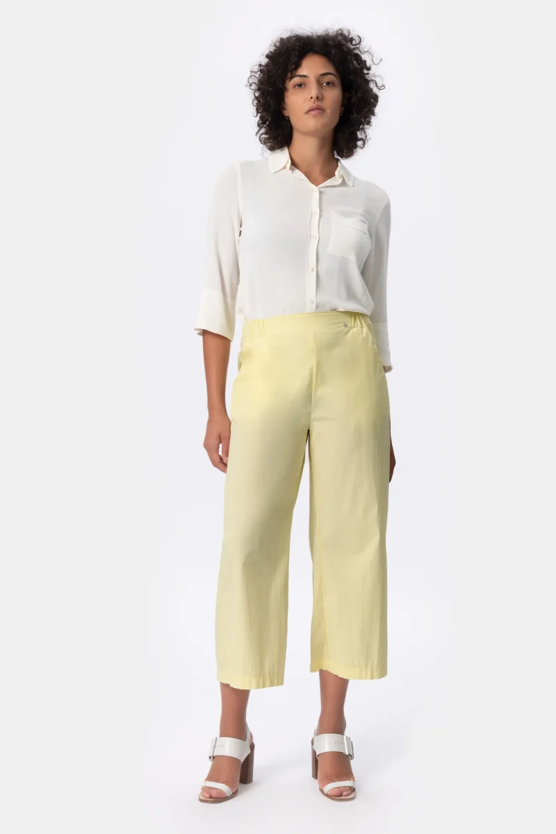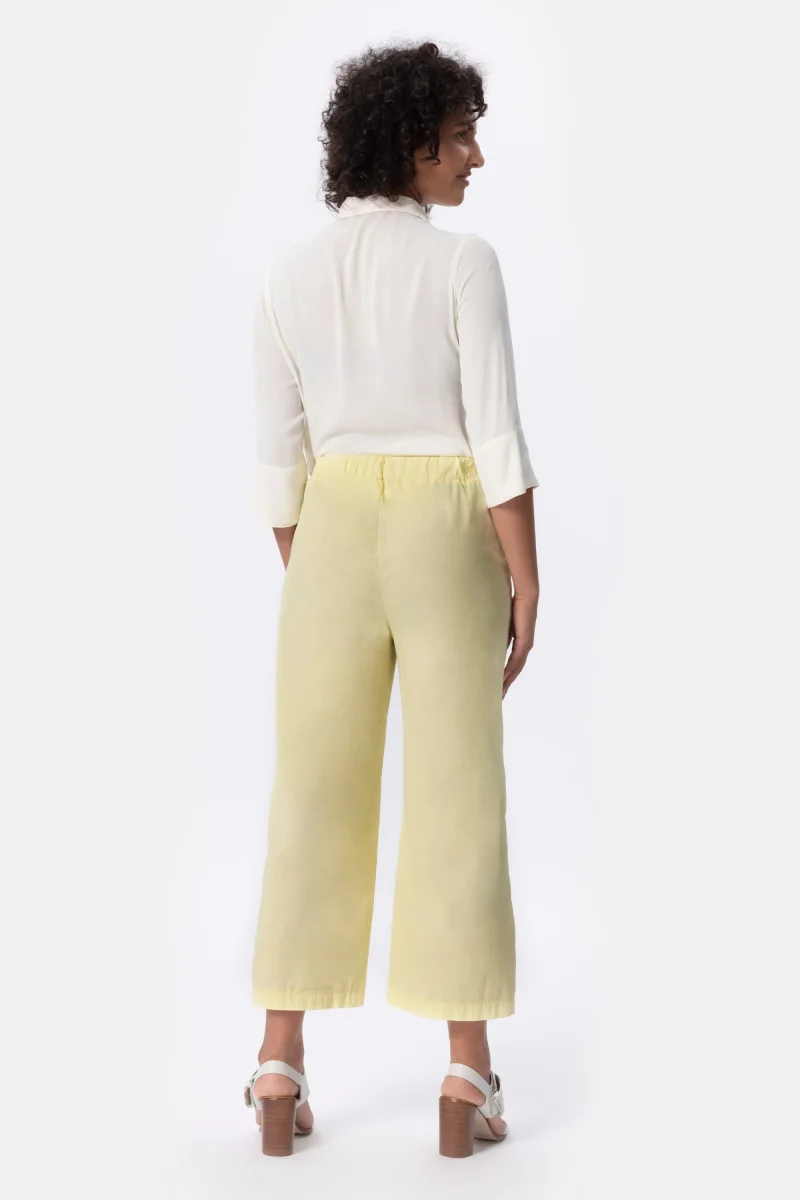 Pantalone wide leg in cotone ultra light stretch. Pantalone dalla vita media. Attuale dona comoditร e freschezza. Un pantalone morbido, quotidiano e fresco per le giornate piรน calde. Un must have per lโestate.