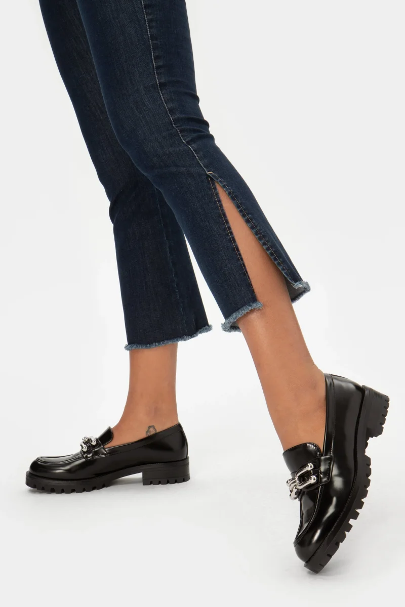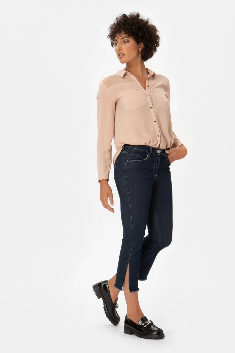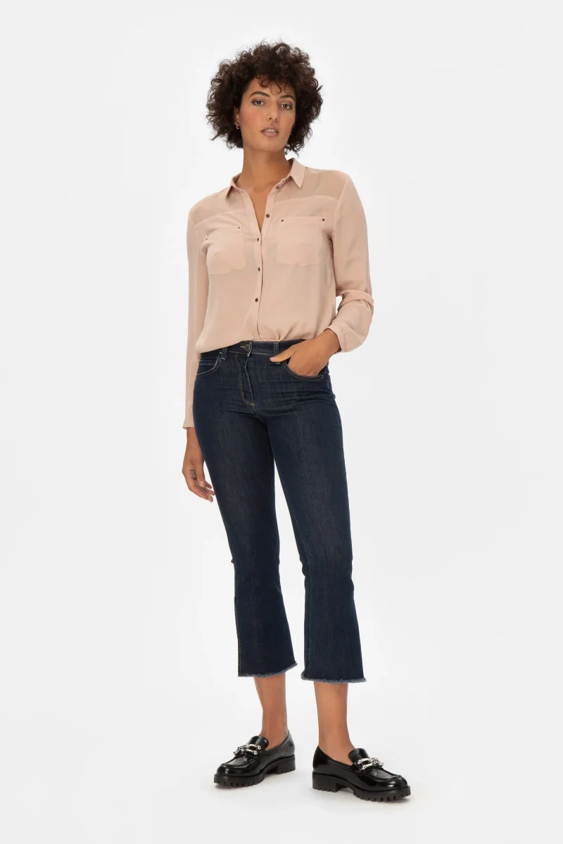 Jeans Donna Cropped Flare Peso tessuto: primavera/estate Denim super stretch con fondo a campana, spacco e orlo sfrangiatoJeans 5 tasche in denim blue di cotone super stretch a trombetta con orlo sfragiato e dettaglio spacco. Fit aderente svasato al fondo, con vita regolare e chiusura con bottone e zip. Un jeans attuale, comodo e per […]