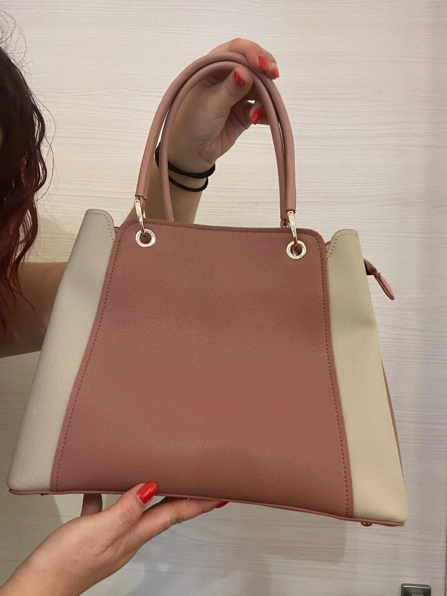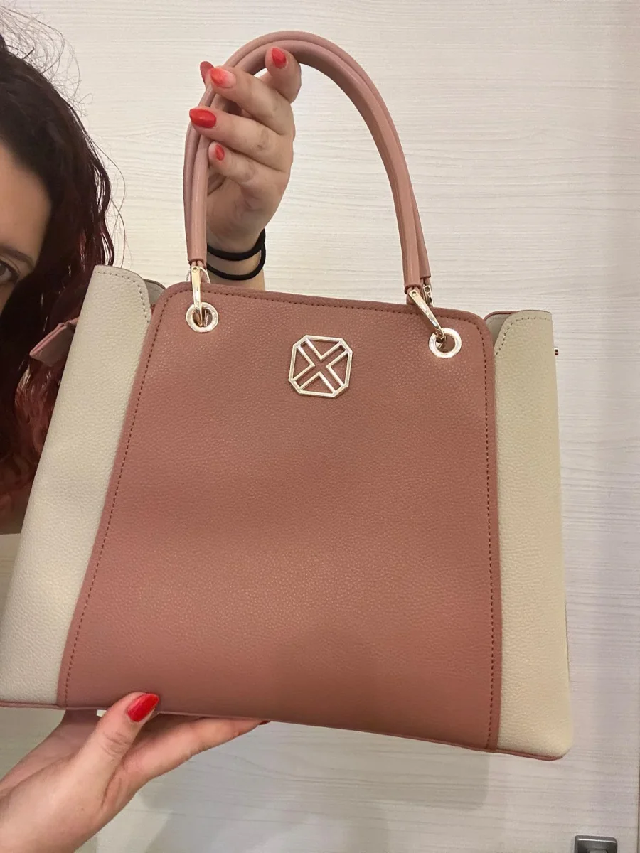 Borsa a spalla con design bicolore rosa cipria e beige, arricchita da dettagli metallici dorati. Elegante e moderna, รจ perfetta per aggiungere un tocco sofisticato al look quotidiano.