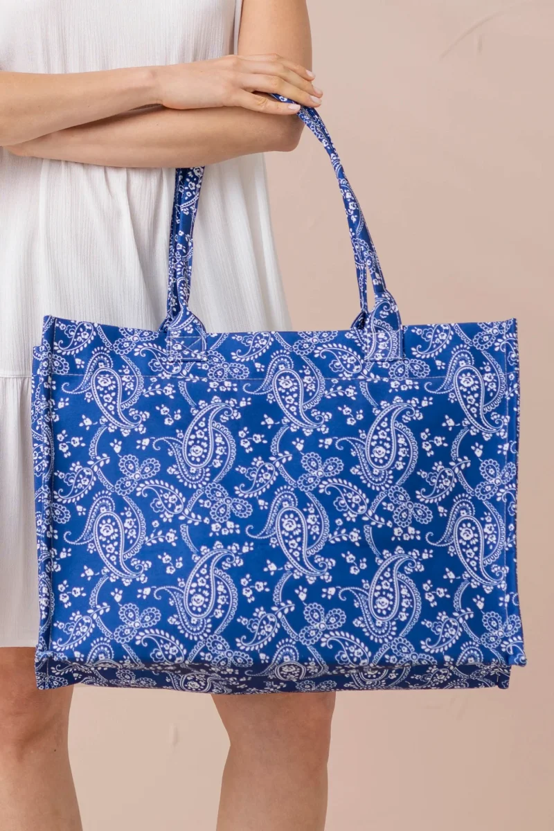 Borsa con chiusura con zip in misura 42x36x6 cm in elegante stampa cachemire. Capiente e versatile, รจ perfetta per portare con te tutto il necessario