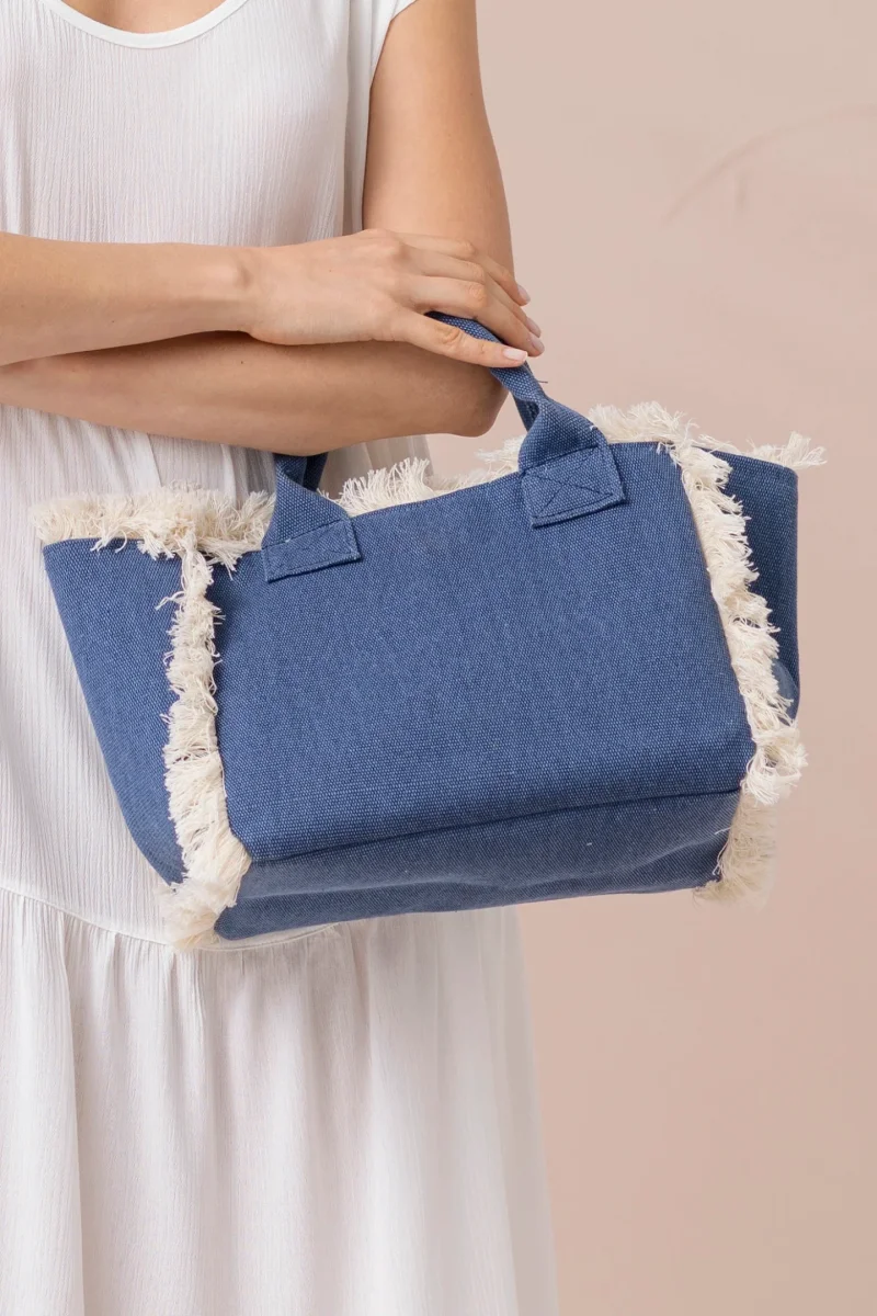 Borsa con chiusura zip articolo sunrise in misura 28x22x15 cm cm tessuto robusto effetto denim garantisce resistenza e versatilitร . Dotata di comodi manici per un trasporto pratico e dettagli a frange lungo i lati