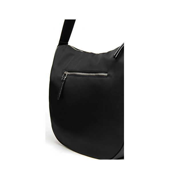 Borsa Hobo a mezza luna realizzata in tessuto tecnico con comoda chiusura con cerniera. Al suo interno un ampio scomparto foderato in tessuto con tasca chiusa da zip. Il modello presenta anche una tasca posteriore conย cerniera, la tracolla in tessuto loggato รจ regolabile. Made in Italy.