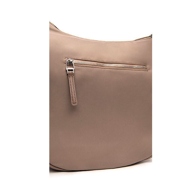 Borsa Hobo a mezza luna realizzata in tessuto tecnico con comoda chiusura con cerniera. Al suo interno un ampio scomparto foderato in tessuto con tasca chiusa da zip. Il modello presenta anche una tasca posteriore conย cerniera, la tracolla in tessuto logata รจ regolabile. Made in Italy