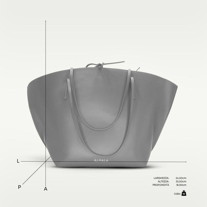 La shopper VICTORIA della collezione รLMALA Firenze | PE25 combina qualitร artigianale e design moderno. Realizzata in pelle, si distingue per la doppia portabilitร handle e crossbody, offrendo stile e praticitร . Con una silhouette a trapezio e una capienza generosa, รจ completata da una busta interna in tessuto con zip, una tracolla in pelle removibile.