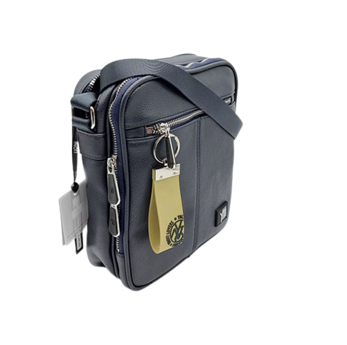 Borsello Uomo linea professional in ecopelle blu. Chiusura con cerniera. 2 comparti. Cerniera e tasche interne. Tracolla regolabile. Portachiavi loggato removibile.