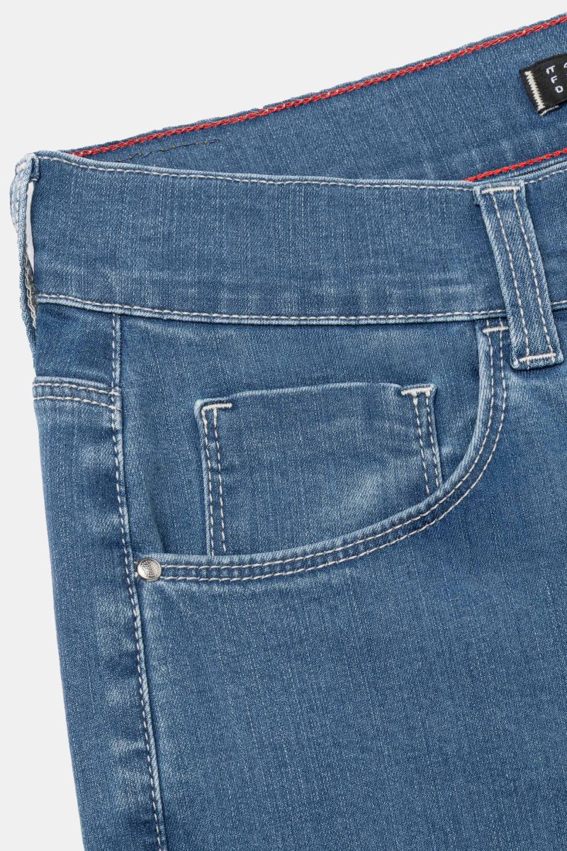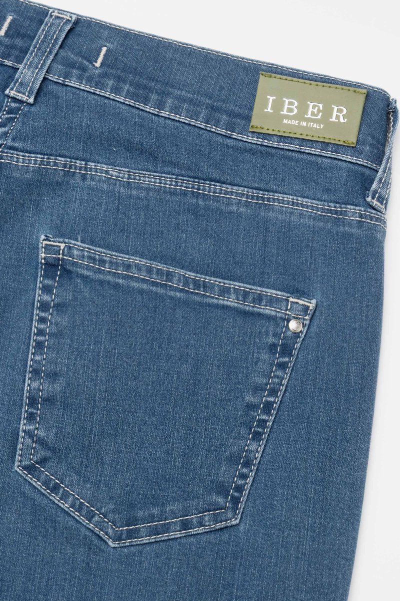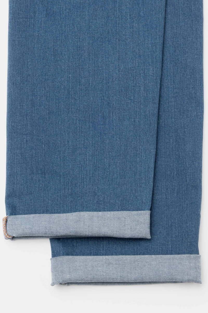 Jeans denim blue super stretch con vestibilitร slim e risvolto al fondo. Questo modello รจ costruito con vita media elasticizzata, chiusura con zip e bottone, pratiche tasche. Un jeans attuale, comodo e per ogni occasioni da quelle piรน quotidiane a quelle piรน eleganti.