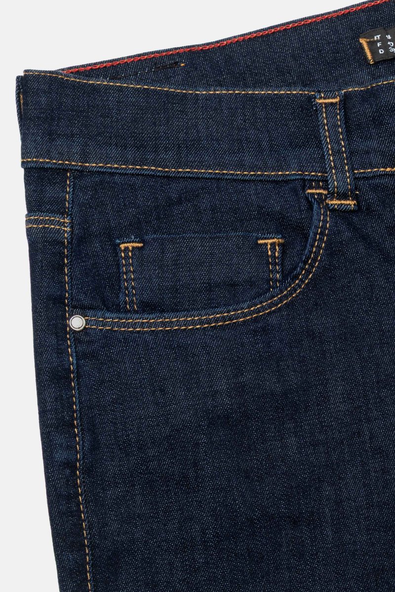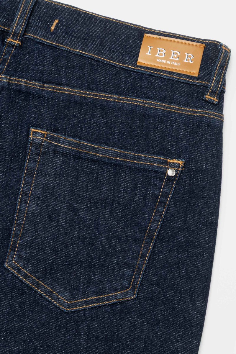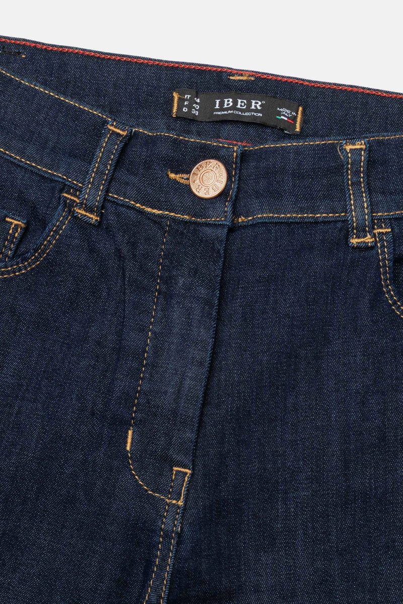 Jeans denim blue super stretch con vestibilitร slim e risvolto al fondo. Questo modello รจ costruito con vita media elasticizzata, chiusura con zip e bottone, pratiche tasche. Un jeans attuale, comodo e per ogni occasioni da quelle piรน quotidiane a quelle piรน eleganti.