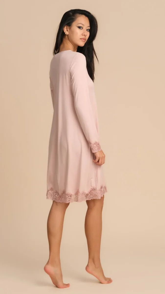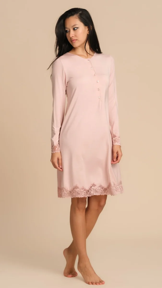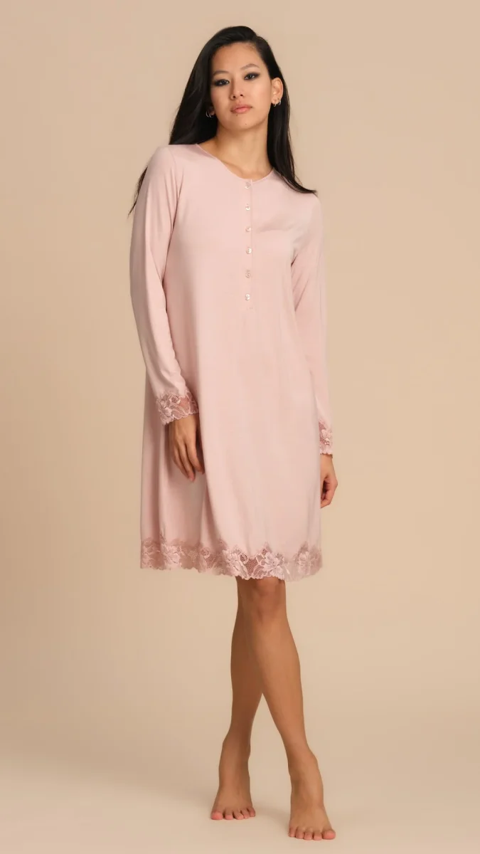CAMICIA DA NOTTE TINTA UNITA CON PIZZO – ROSA PEPITA