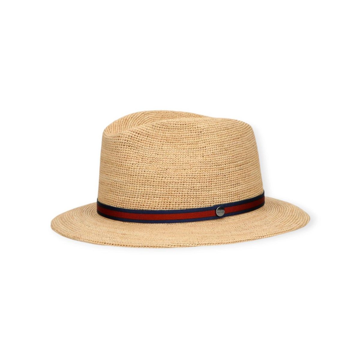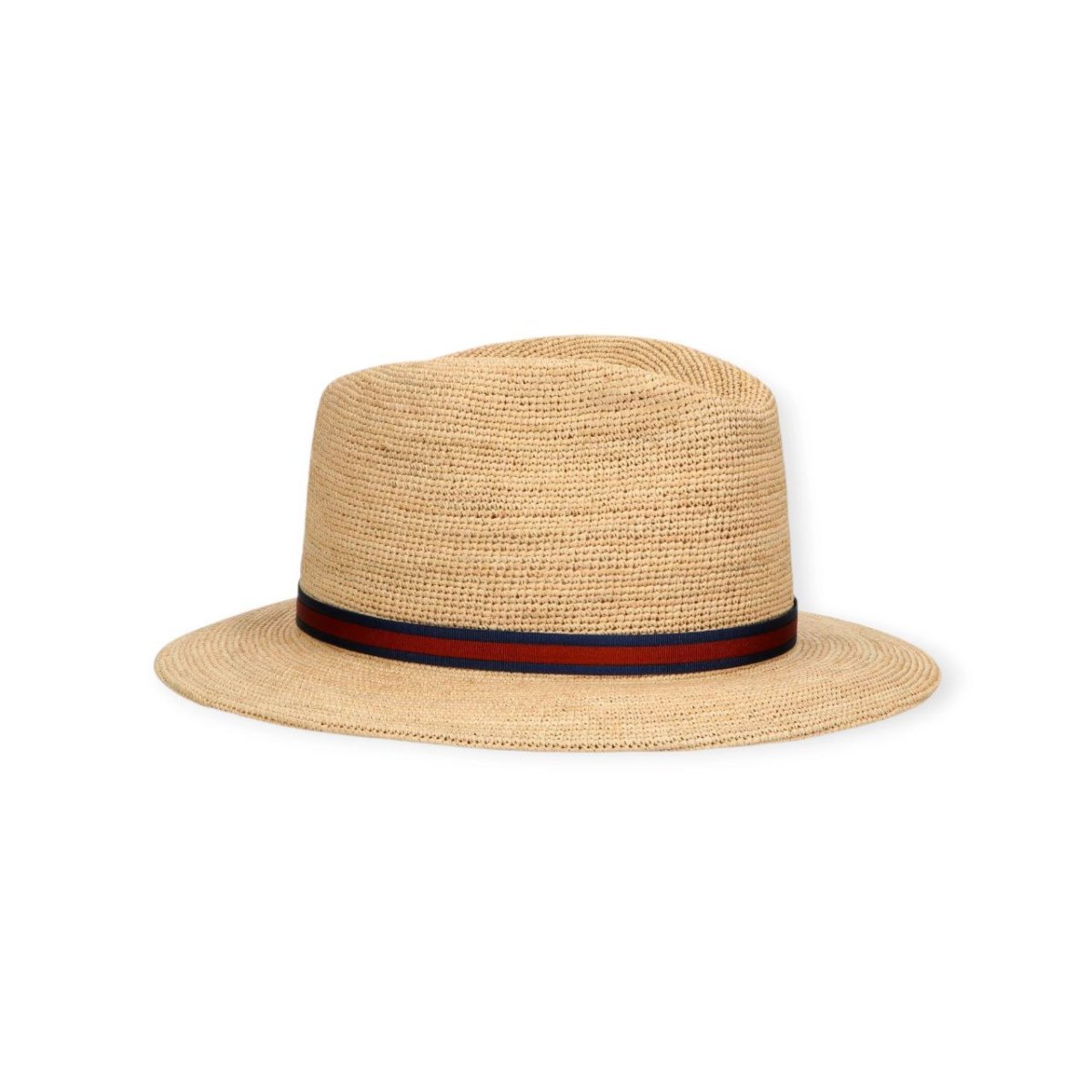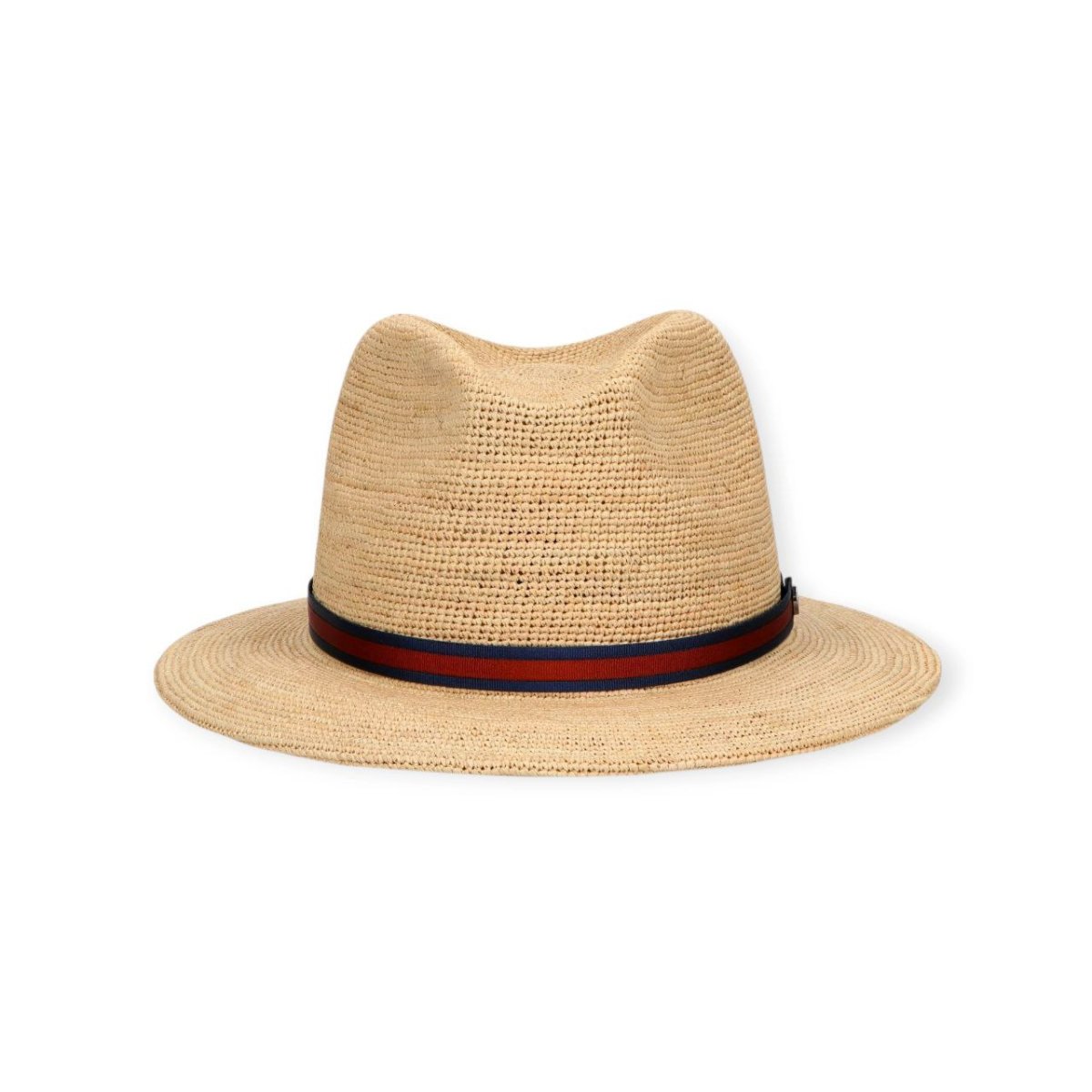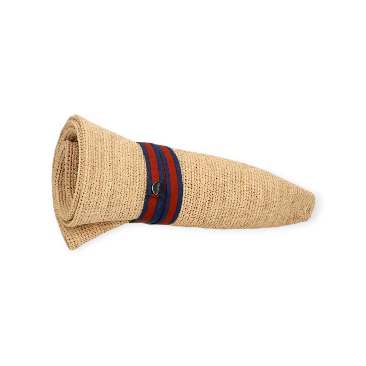 Il cappello Argentina è realizzato in rafia crochet fine, intrecciata manualmente con l’uso di un uncinetto per creare una texture leggera e traspirante. Il design è completato da una fascia bicolore di 1,5 cm con bottone automatico logato, che aggiunge un tocco distintivo. La tesa larga misura circa di 6,5 cm. Il cappello è arrotolabile e viene fornito di dustbag coordinata per praticità e protezione.
