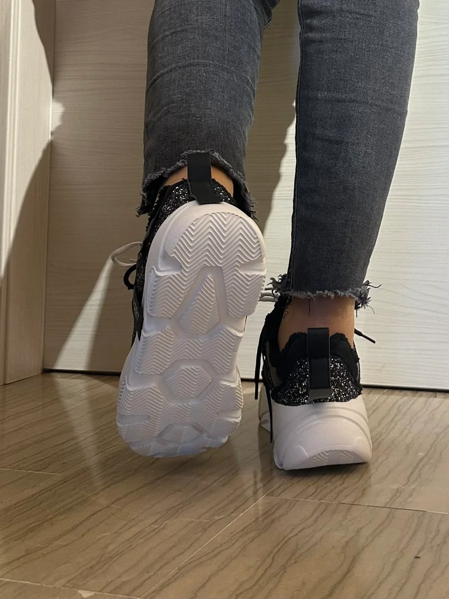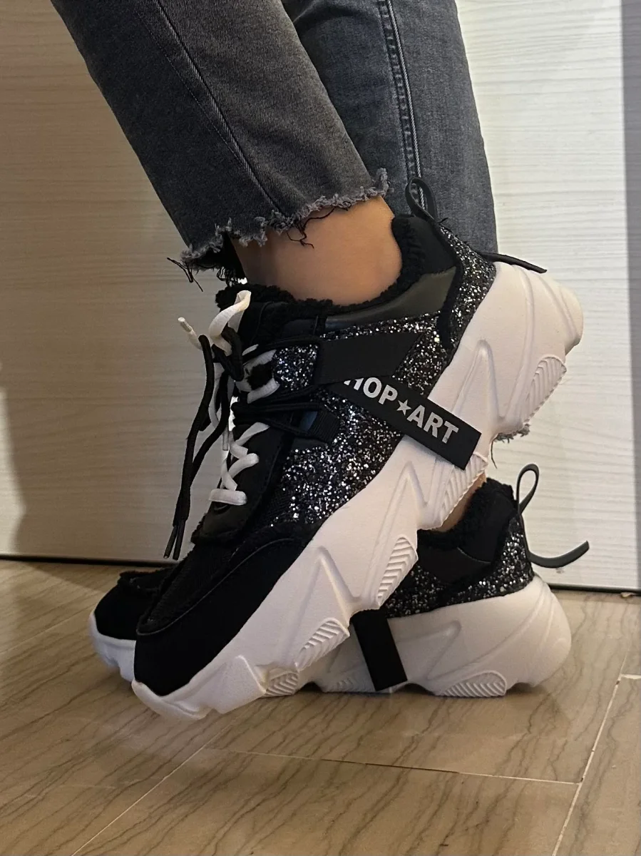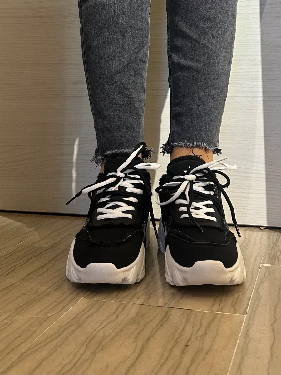 Stai cercando una sneaker calda, perfetta per le tue giornate di lavoro invernali?! Questo modello CHUNKY รจ perfetto, fondo alto bianco effetto basculante, morbido e che accompagna la camminata. Tomaia in tessuto caldo, pieno di ecopelliccia effetto teddy, esternamente piena di strass. Lacci interscambiabili nero o bianco.