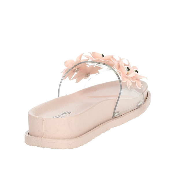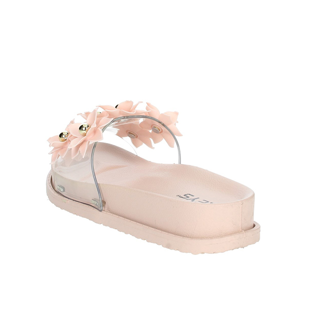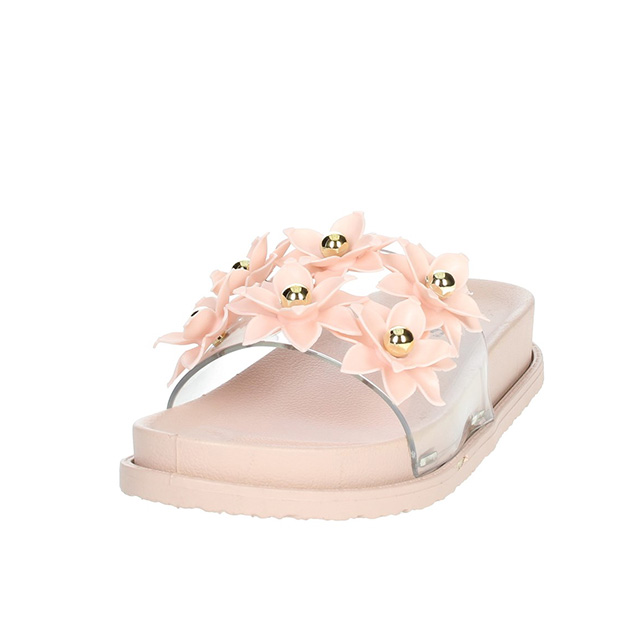 Ciabatta Donna rosa in gomma, con fascia trasparente impreziosita da fiori e perle oro. Comode e pratiche, senza rinunciare al glamour.
