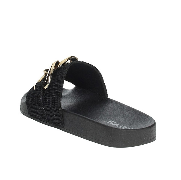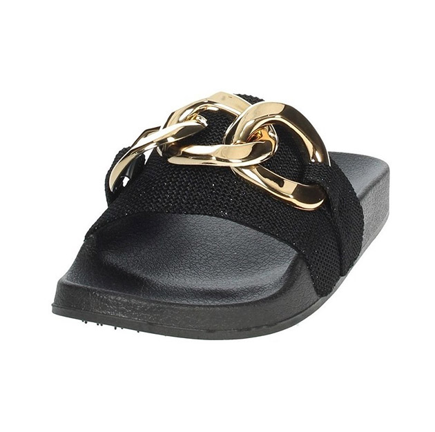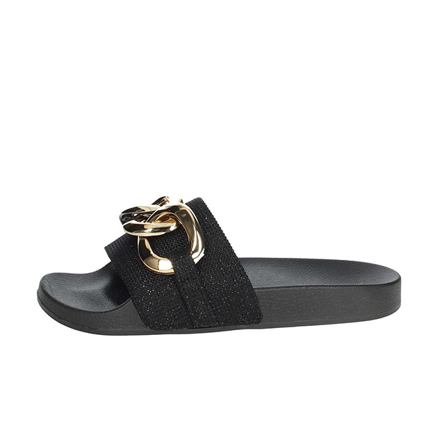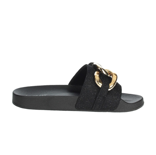 Ciabatta Donna nera in gomma, con fascia glitter impreziosita da dettaglio catena in metal gold. Comode e pratiche, senza rinunciare al glamour.