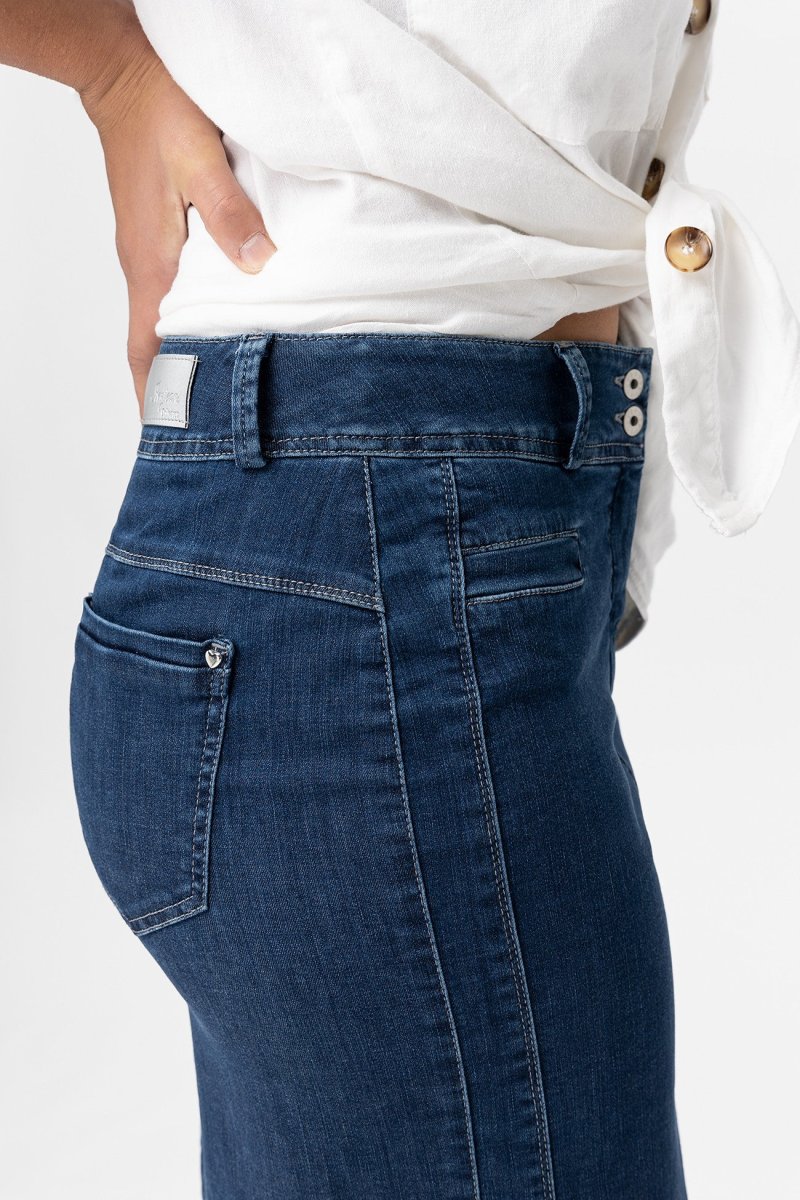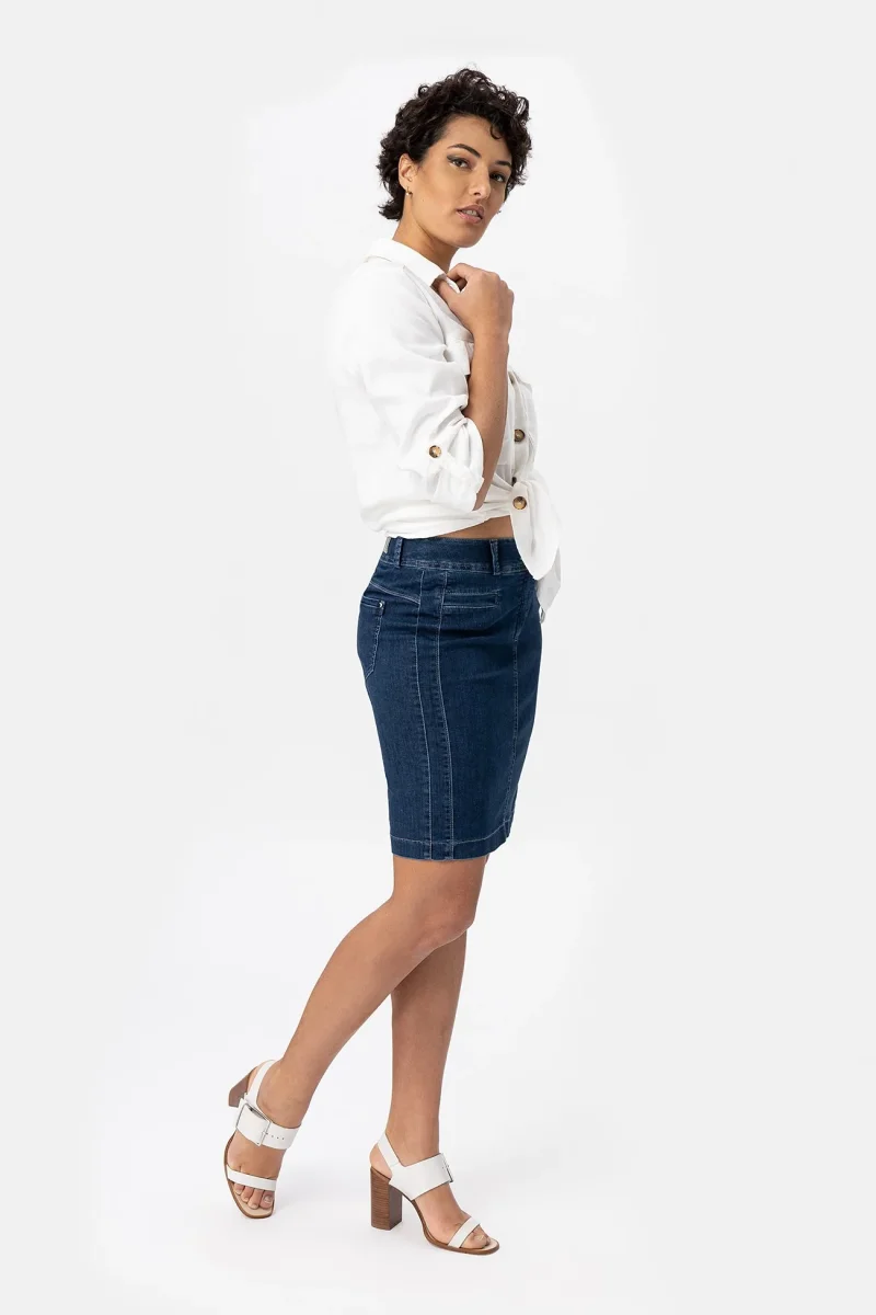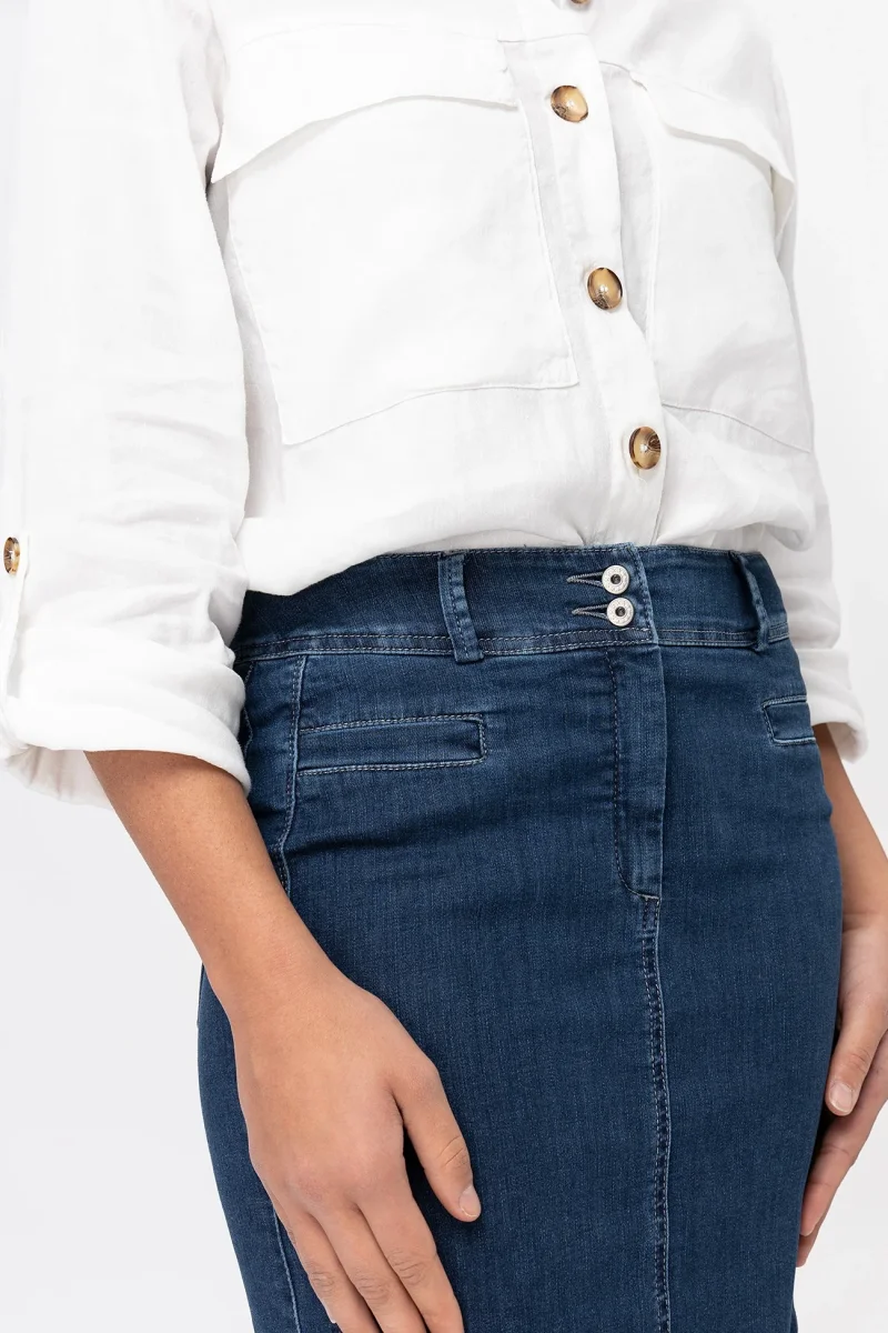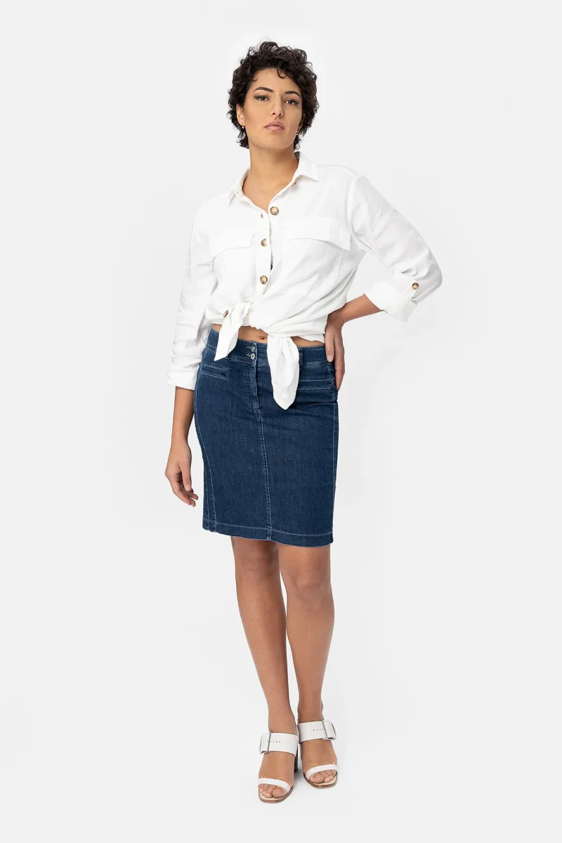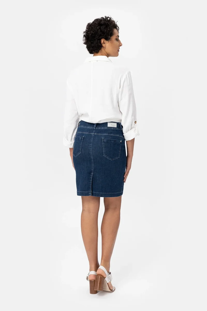 Gonna in denim super stretch che dona comfort e segue le forme in modo naturale. Chiusura zip e bottone. Una gonna elegante e versatile, adatta ad un look formale con un tacco o a quello di tutti i giorni con un sandalo o una sneaker.