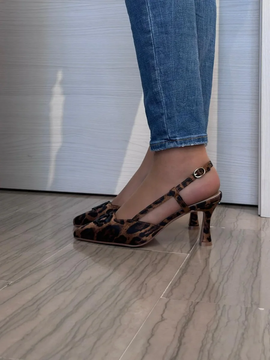 Femminile e grintosa, la décolleté Crichic in raso leopardato con dettagli in pelle e cinturino posteriore aperto slancia la figura con eleganza.