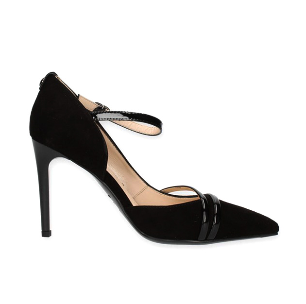 Décolleté Donna nera in camoscio, con inserti in vernice e fibbia alla caviglia. Design raffinato ed elegante, per un must che non può mancare nel guardaroba. Made in Italy.