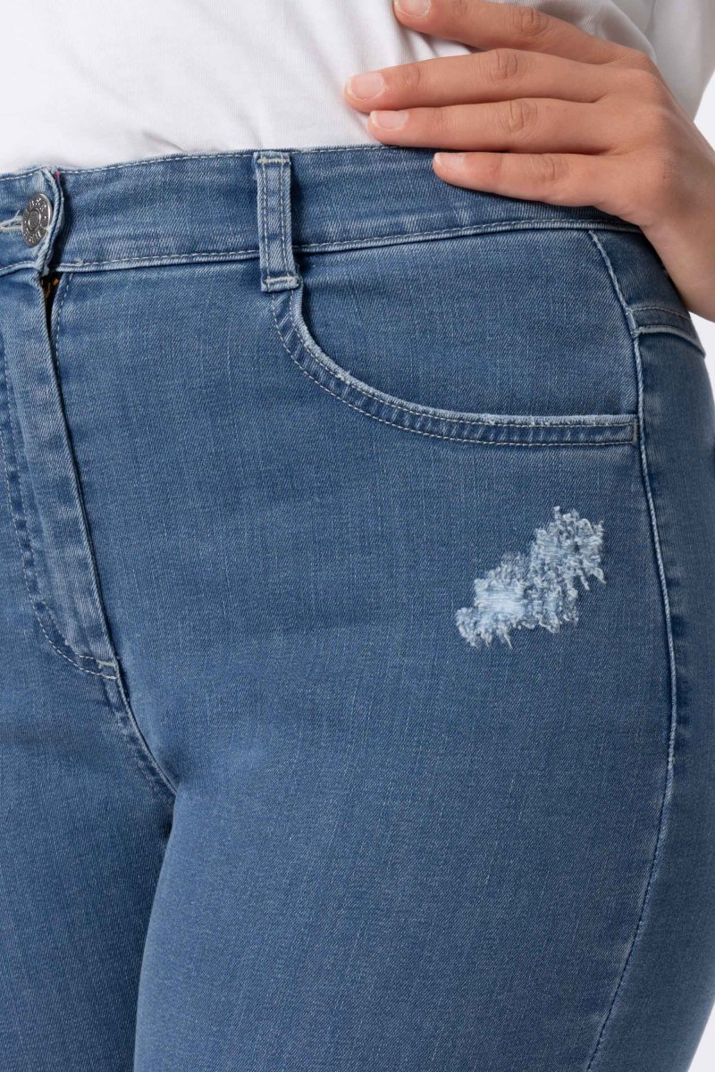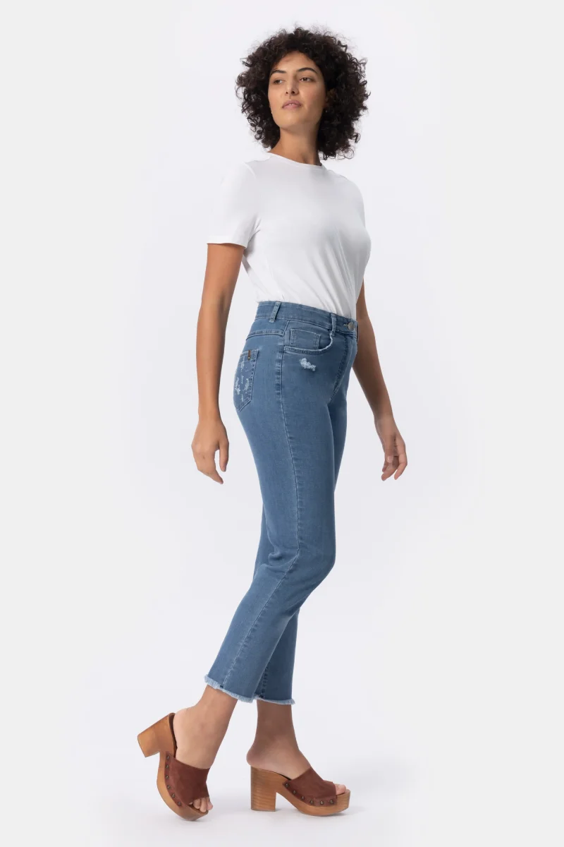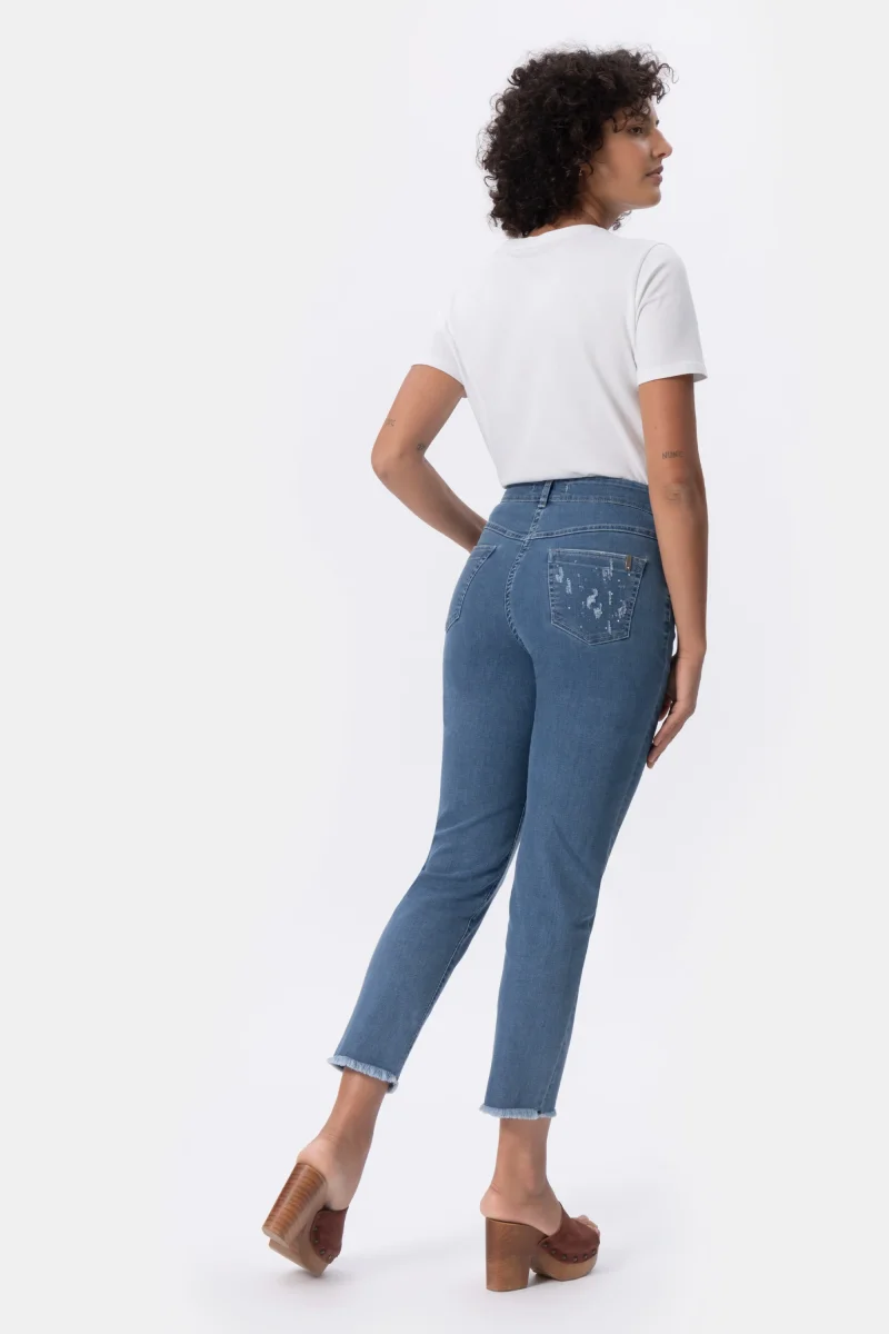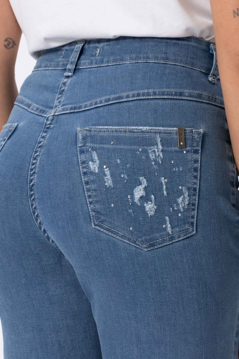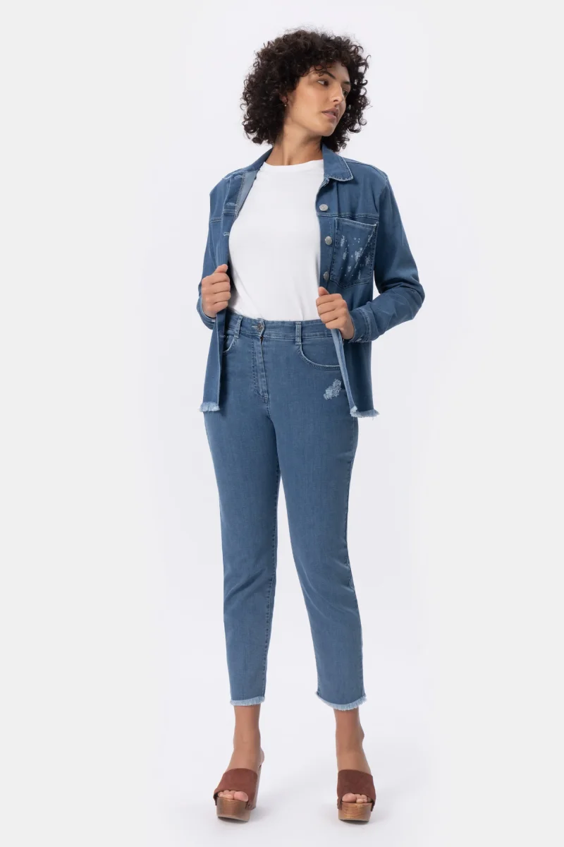 Jeans Donna Relax Fit Denim stretch Peso tessuto: 4 stagioni Pantalone 5 tasche in jeans in cotone stretch, con vestibilitร morbida. Questo modello รจ costruito con vita media elasticizzata per la massima comoditร . La forma del pantalone non aderente e attuale dona comoditร . Dettaglio abrasioni, strass e fondo sfrangiato che donano tendenza e attualitร . Dallโattitudine […]