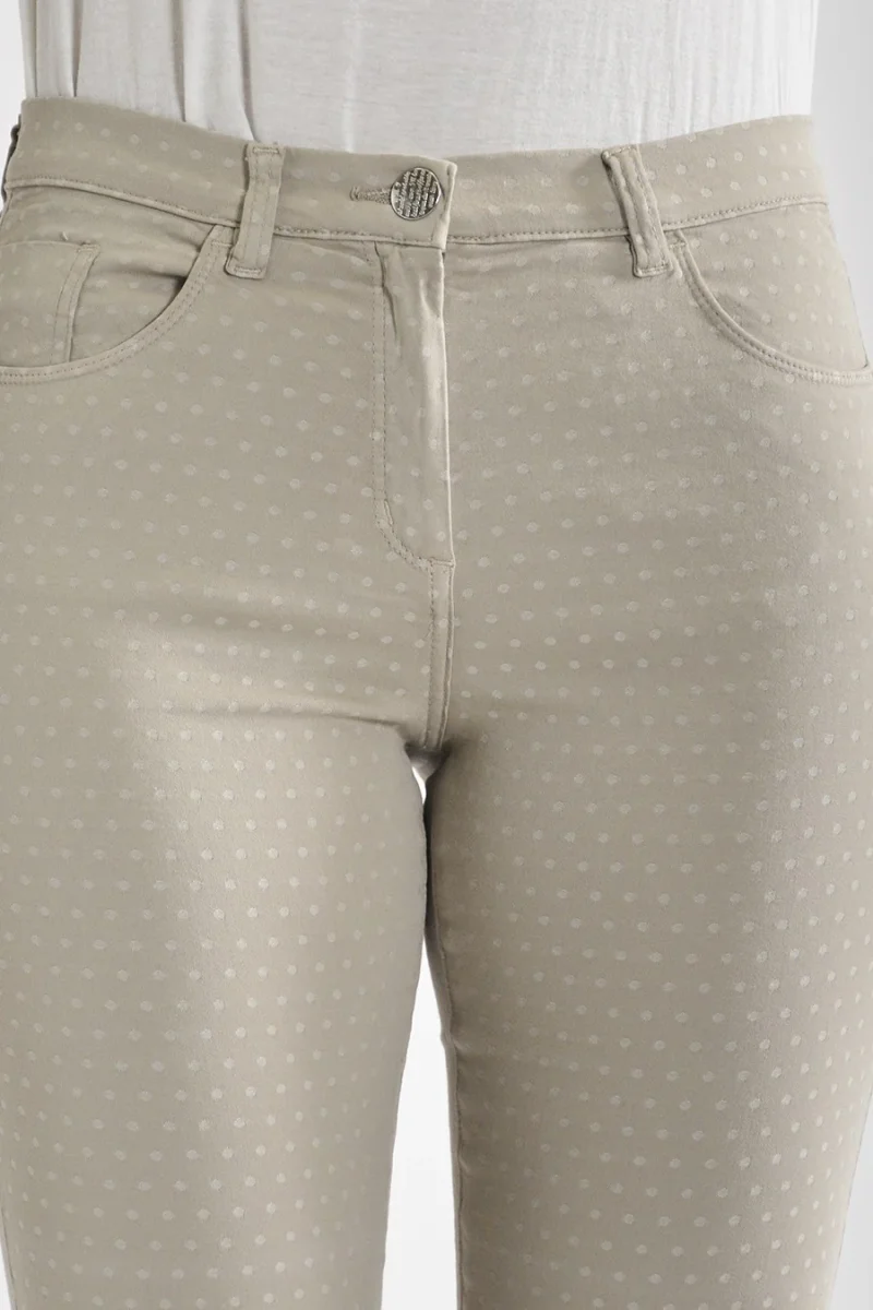 Pantalone Donna Slim Cotone stretch fantasia jacquard Peso tessuto: prrimavera/estate Pantalone in cotone stretch disegno jacquard Vestibilitร slim Vita media Modello 5 tasche La modella รจ alta 177cm e indossa la taglia 42 nel colore Topaz e taglia 44 negli altri colori Composizione: 60%cotone 37%viscosa 3%elastan Manutenzione: