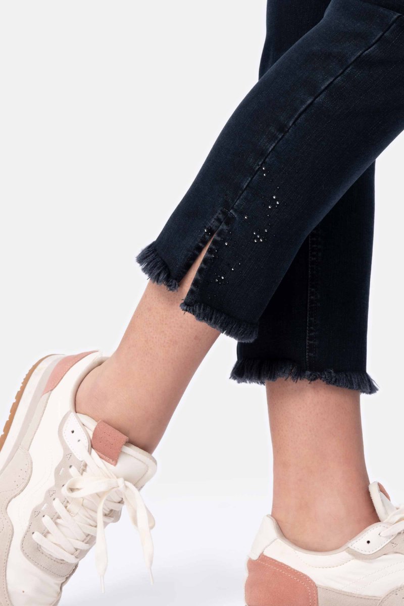 Denim super stretch, 5 tasche in denim black di cotone super stretch con orlo sfragiato, dettaglio spacco e strass. Fit aderente, vita regolare e chiusura con bottone e zip. Un jeans attuale, comodo e per ogni occasione, da quelle piรน quotidiane a quelle piรน eleganti.