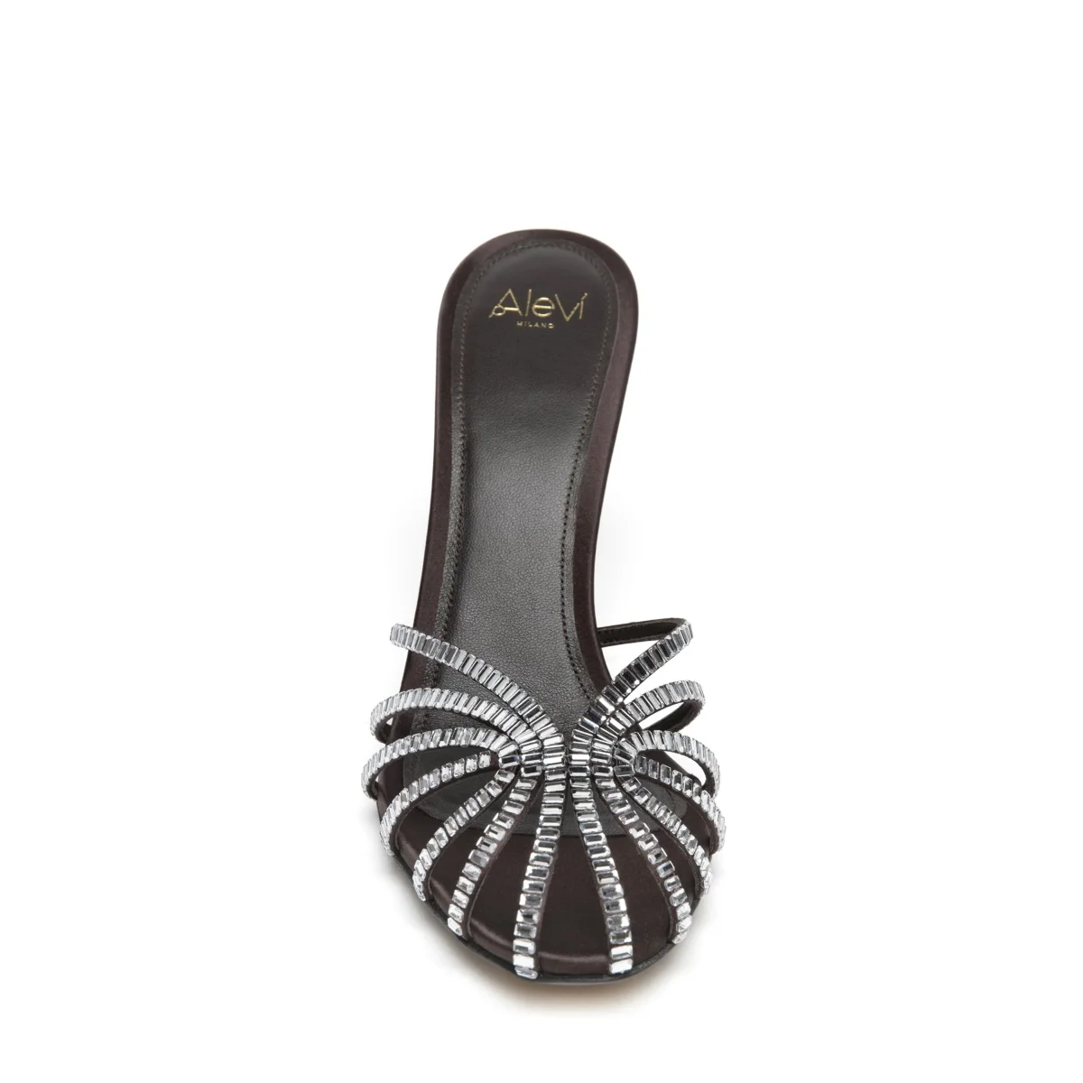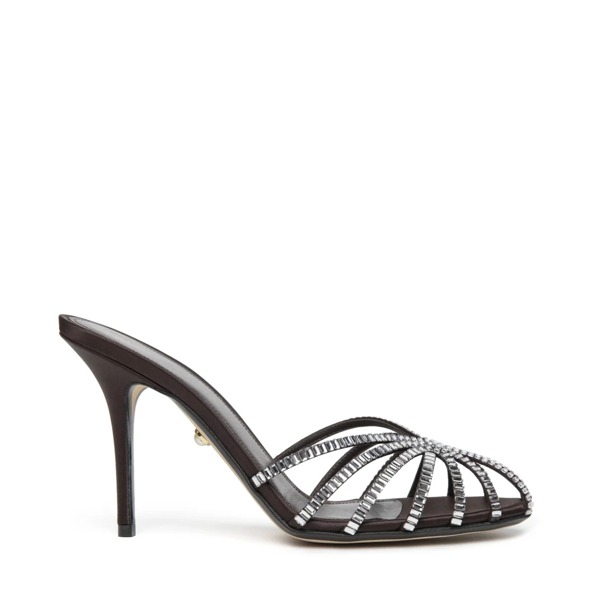 Sabot gabbia in raso ricoperta di cristalli baguette. Tacco laccato in tono.