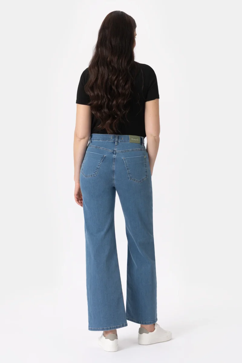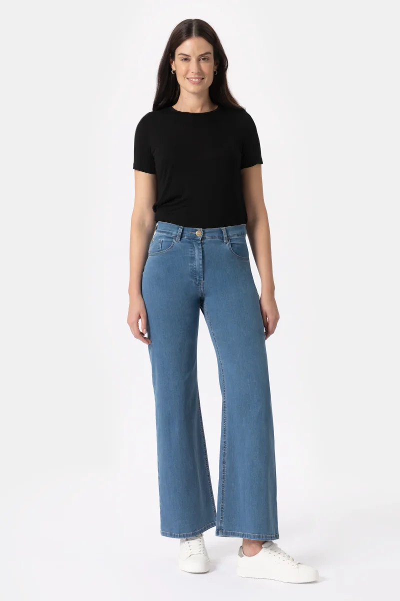 Jeans in denim blu super stretch con vestibilitร palazzo e gamba ampia. Questo modello รจ costruito con vita regolare elasticizzata, chiusura con zip e bottone. Un pantalone attuale, comodo e per ogni occasione, da quelle piรน quotidiane a quelle piรน eleganti. Abbinalo al sandalo giusto e sarร un capo essenziale per questa stagione, facendoti sentire attuale e alla moda.